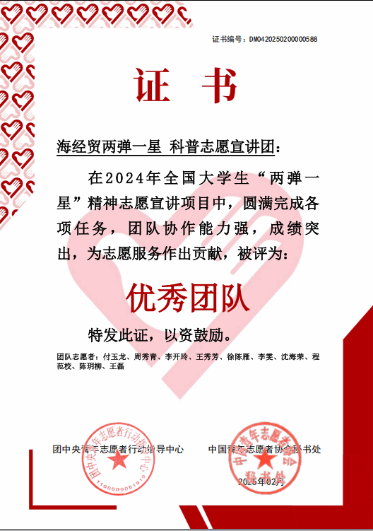 近日,团中央青年志愿者行动指导中心、中国青年志愿者协会秘书处评选出100支2024年全国大学生“两弹一星”精神志愿宣讲项目“优秀团队”。米兰milan官方网站“两弹一星”精神科普志愿宣讲团精心筹备,充分发挥专业特色,圆满完成宣讲任务,在全国870所高校1000支团队中脱颖而出,获得“优秀团队”荣誉称号。