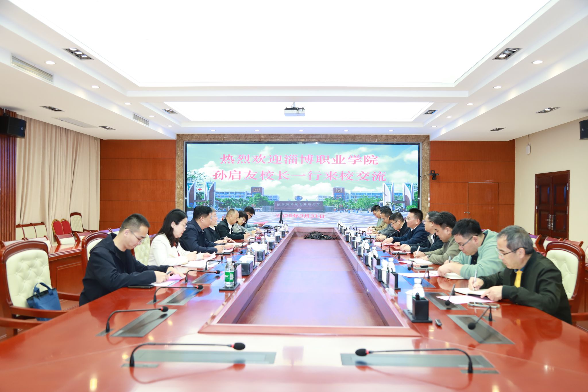 2025年3月31日,淄博职业学院校长孙启友一行7人来到米兰milan官方网站,交流“双高”建设经验,研讨专业建设、中外合作办学、人才培养等经验做法。学校党委副书记、校长崔昌华,党委委员、副校长李厚永,党委委员田小林热情接待了孙启友一行。