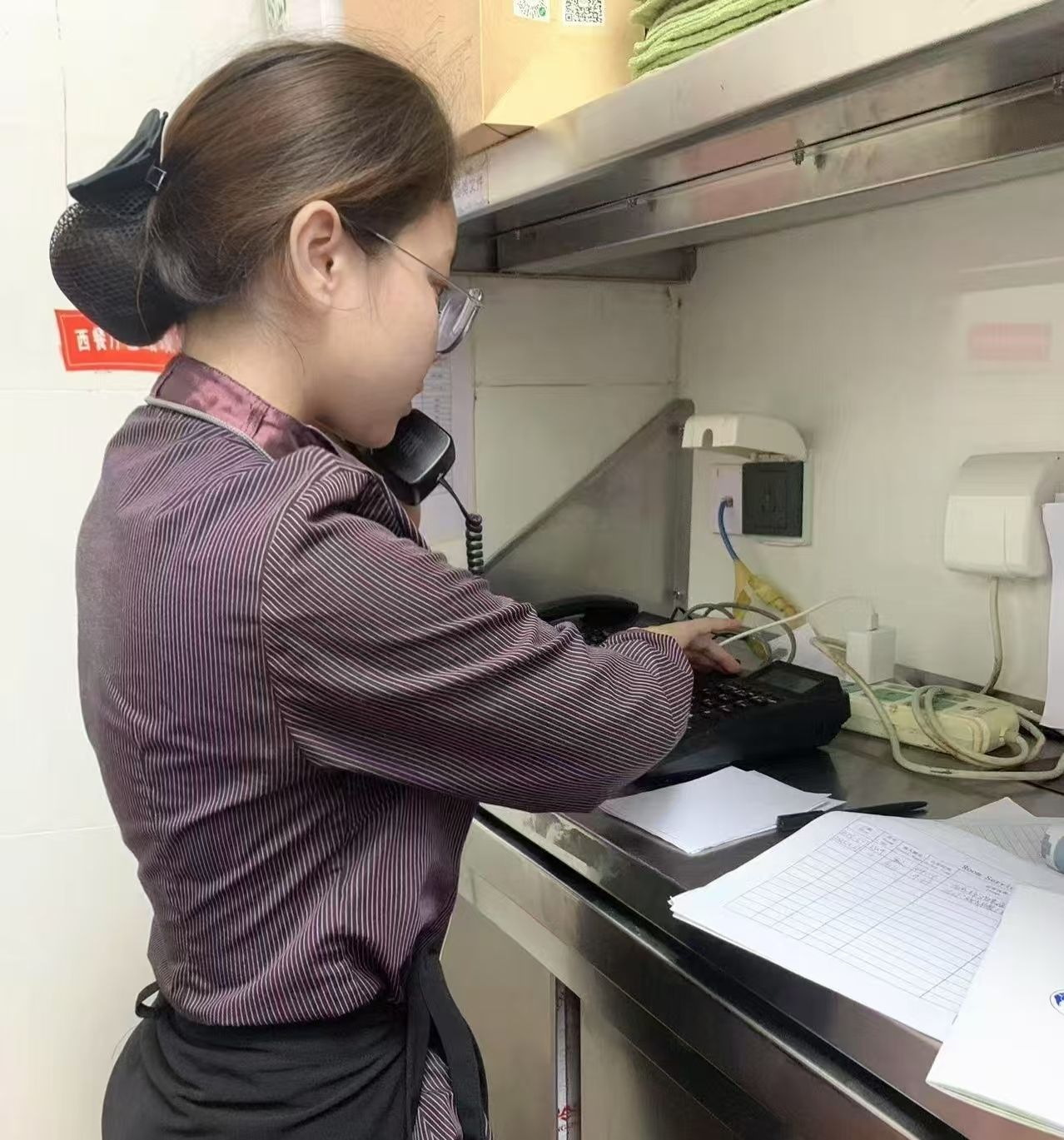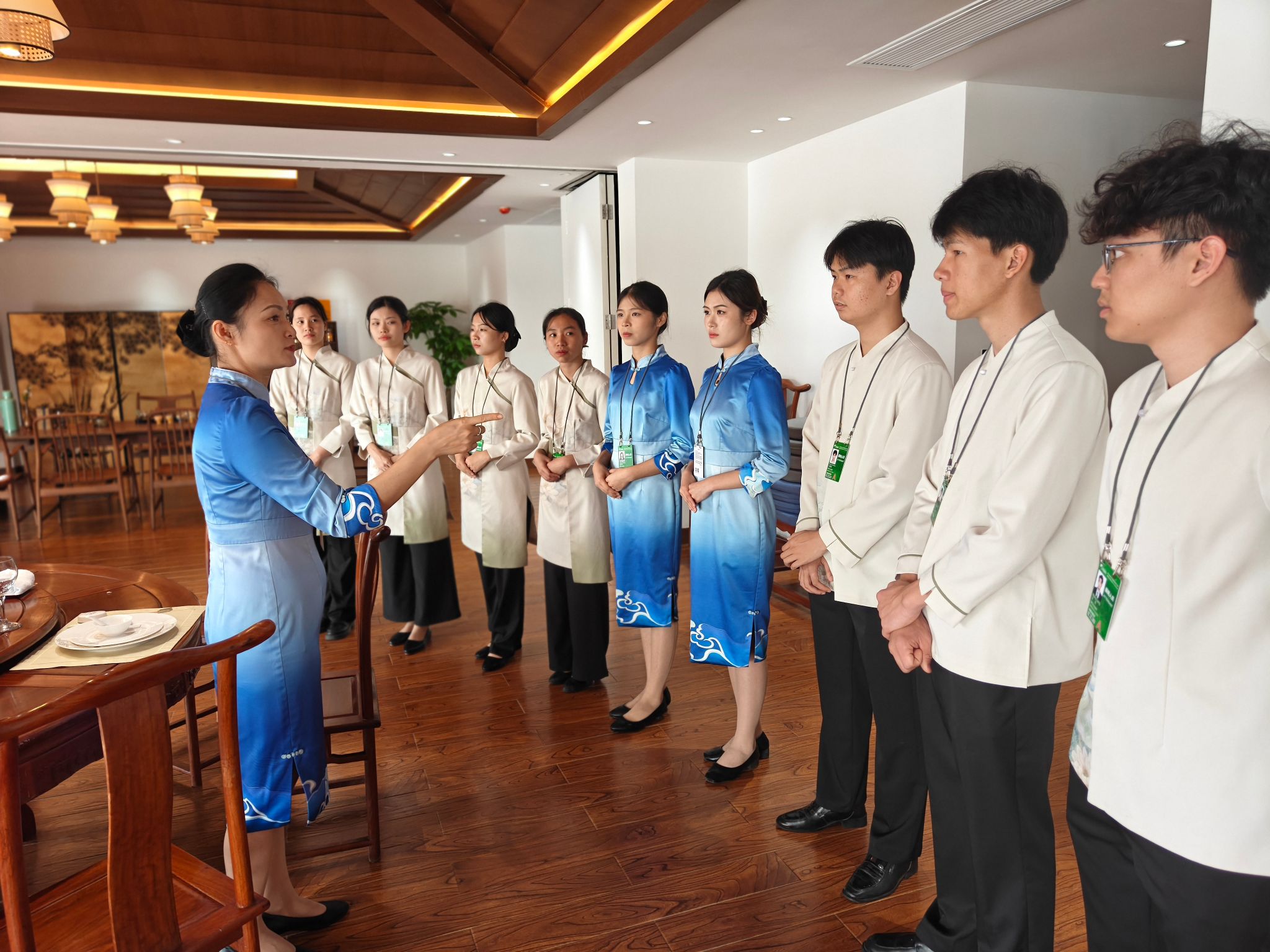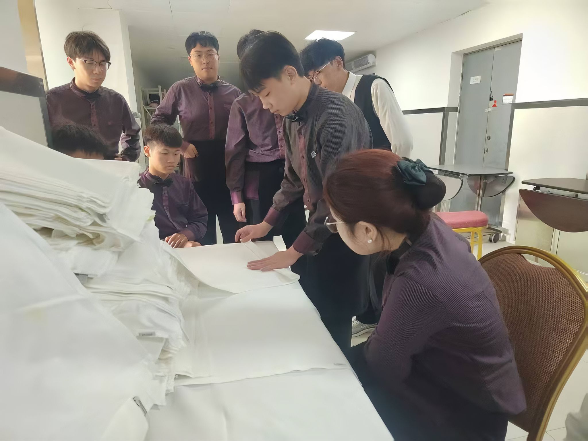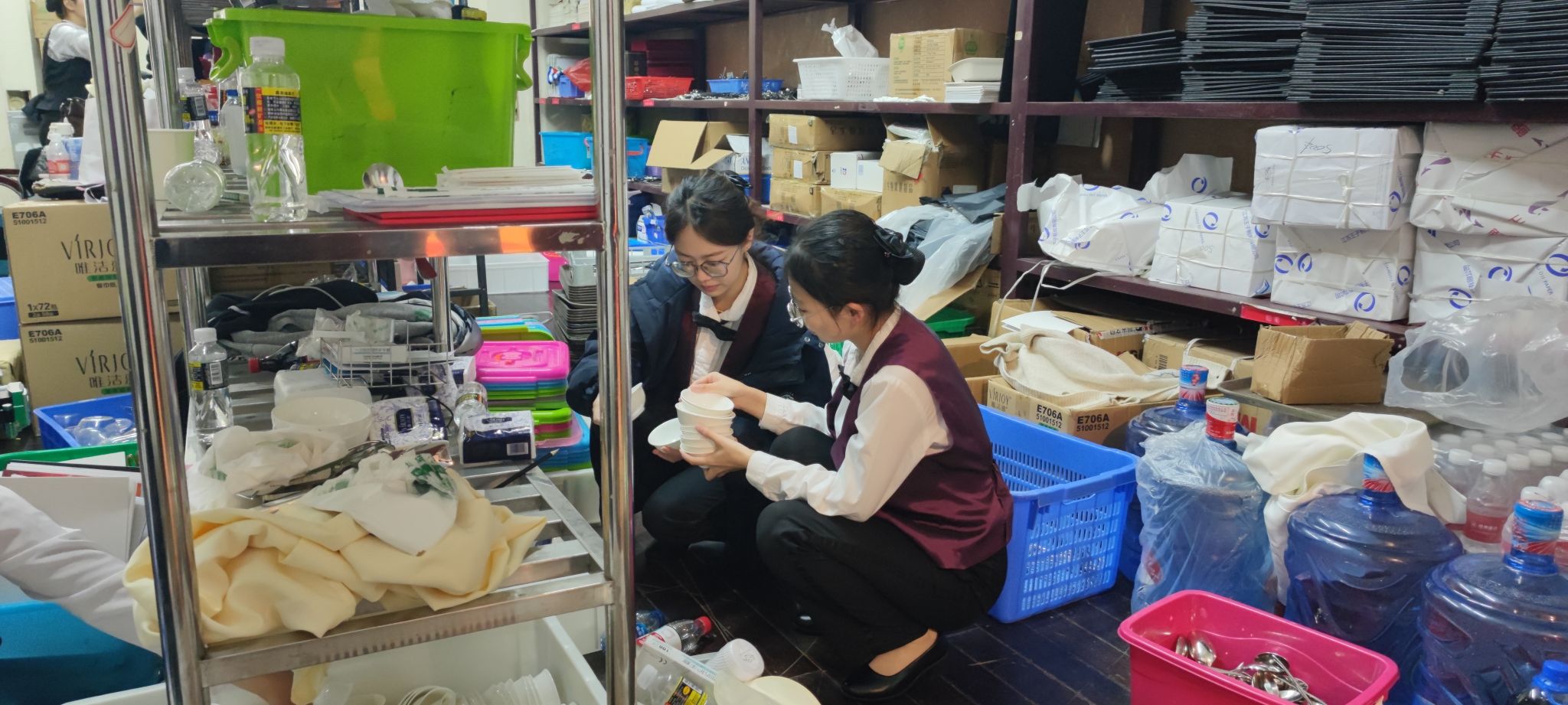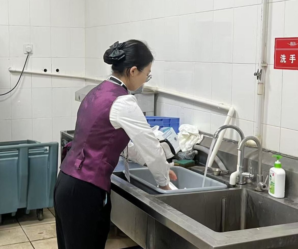 作为杯具清洁负责人的周雨露,需要确保每个杯体无尘无渍,并根据不同宴席需求精准配发器皿。这段实践经历让她提升了职业素养,与外宾的互动更让她的双语沟通能力突飞猛进。