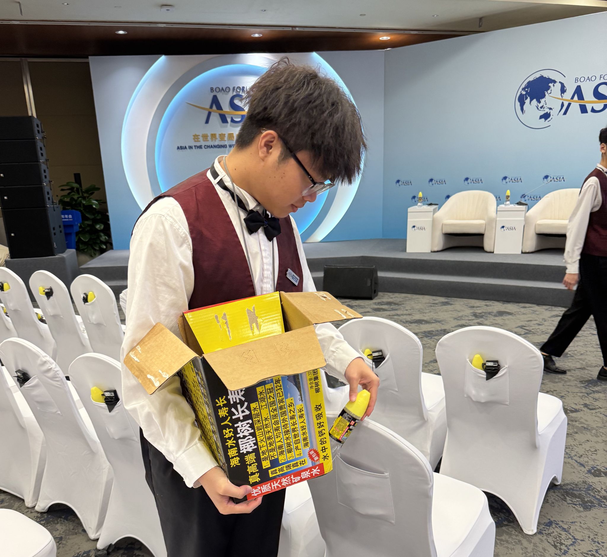 在宴会服务区,志愿者黄奋每天要摆放桌椅、餐具,汗湿的工作服见证着这位“幕后英雄”的付出。他说:“虽然摆台、撤台是基础工作,但看到自己码放的餐具成为宴会厅的风景线,所有的辛苦都值了。”