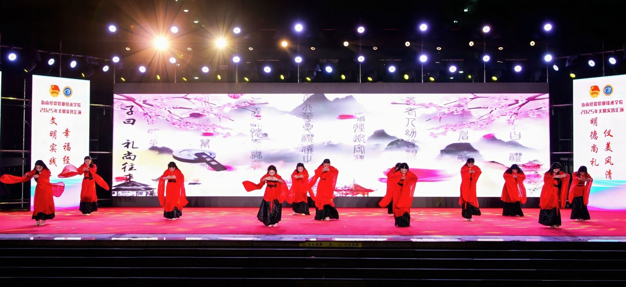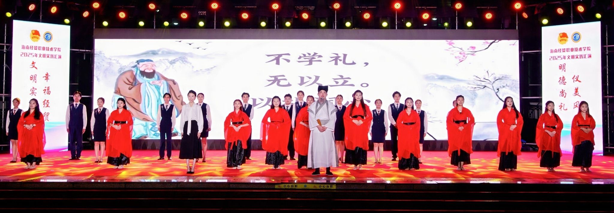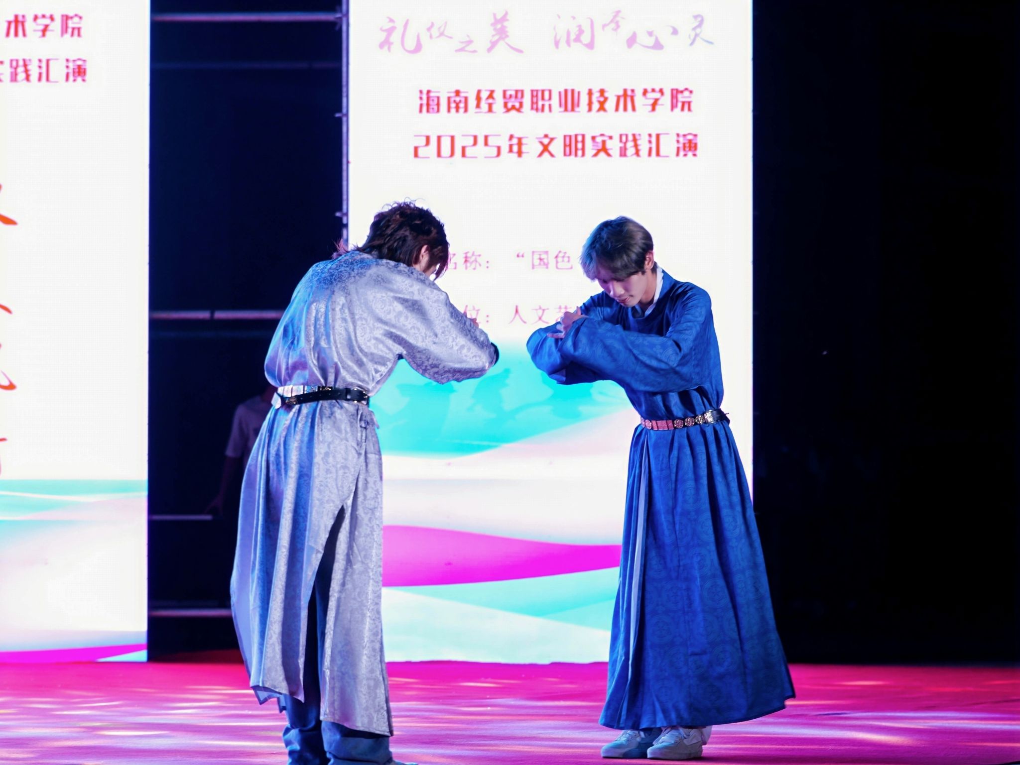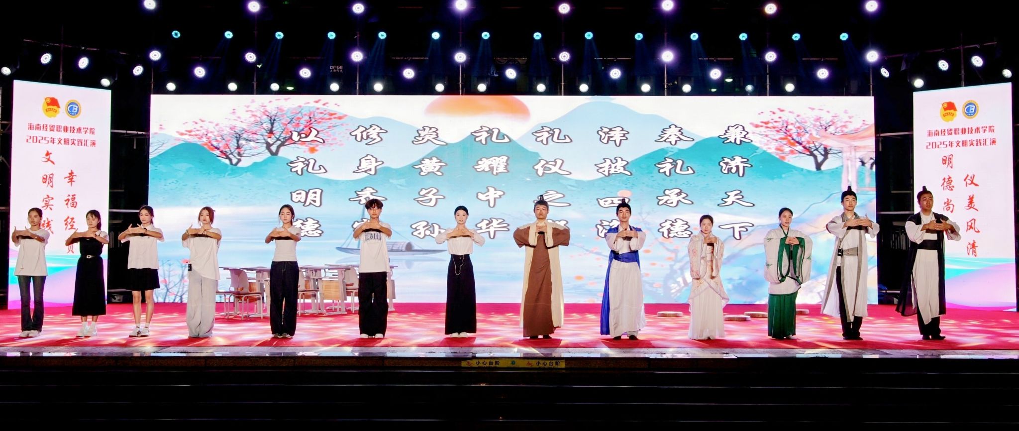 今年是学校“校园文化建设三年行动”计划启动之年。在“礼仪之美,润泽心灵”文明实践汇演中,各二级学院的同学们结合专业特色创新演绎,以丰富多彩的艺术形式展现礼仪文化的育人价值。