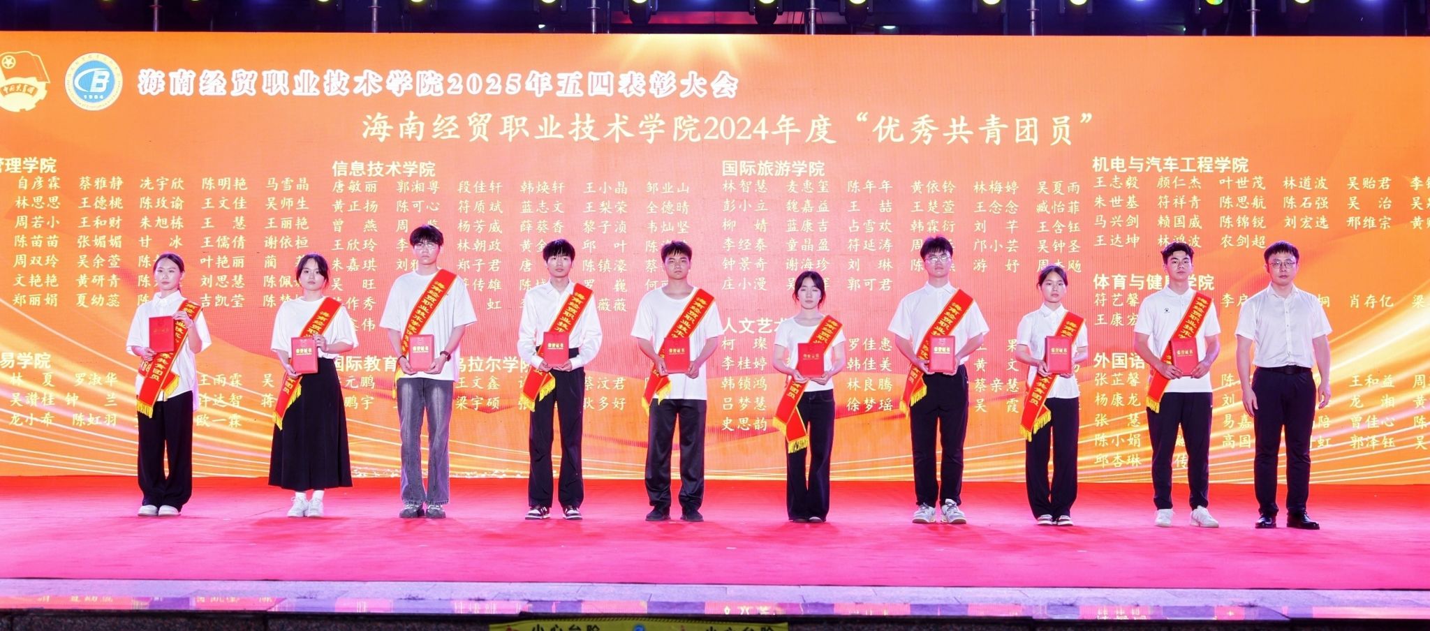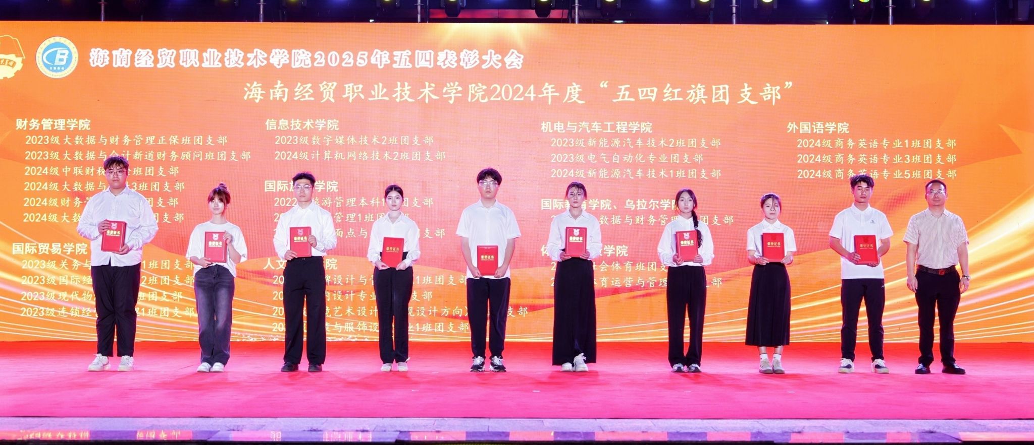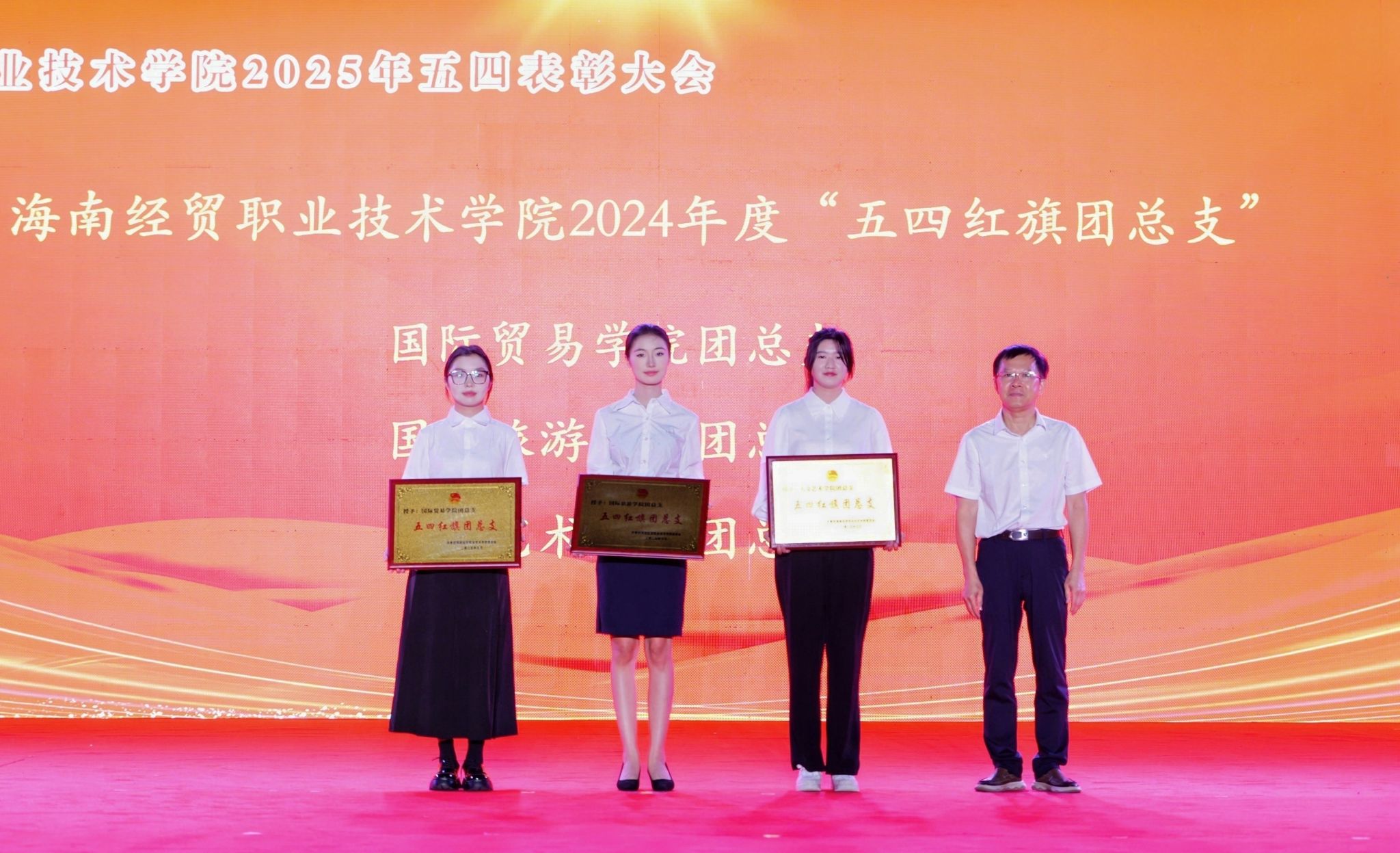 大会对过去一年取得突出成绩的集体和个人进行表彰。国际贸易学院团总支、国际旅游学院团总支、人文艺术学院团总支等3个团组织荣获“五四红旗团总支”,2023级大数据与财务管理正保班团支部等28个团组织荣获“五四红旗团支部”,鄢平牡等9名教师、高泽雨等159名同学荣获“优秀共青团干部”称号,吴绍丹等227名同学荣获“优秀共青团员”称号。王佳婧同学荣获第十四届“经贸自强之星标兵”称号,王沛泽等9名同学荣获第十四届“经贸自强之星”称号。