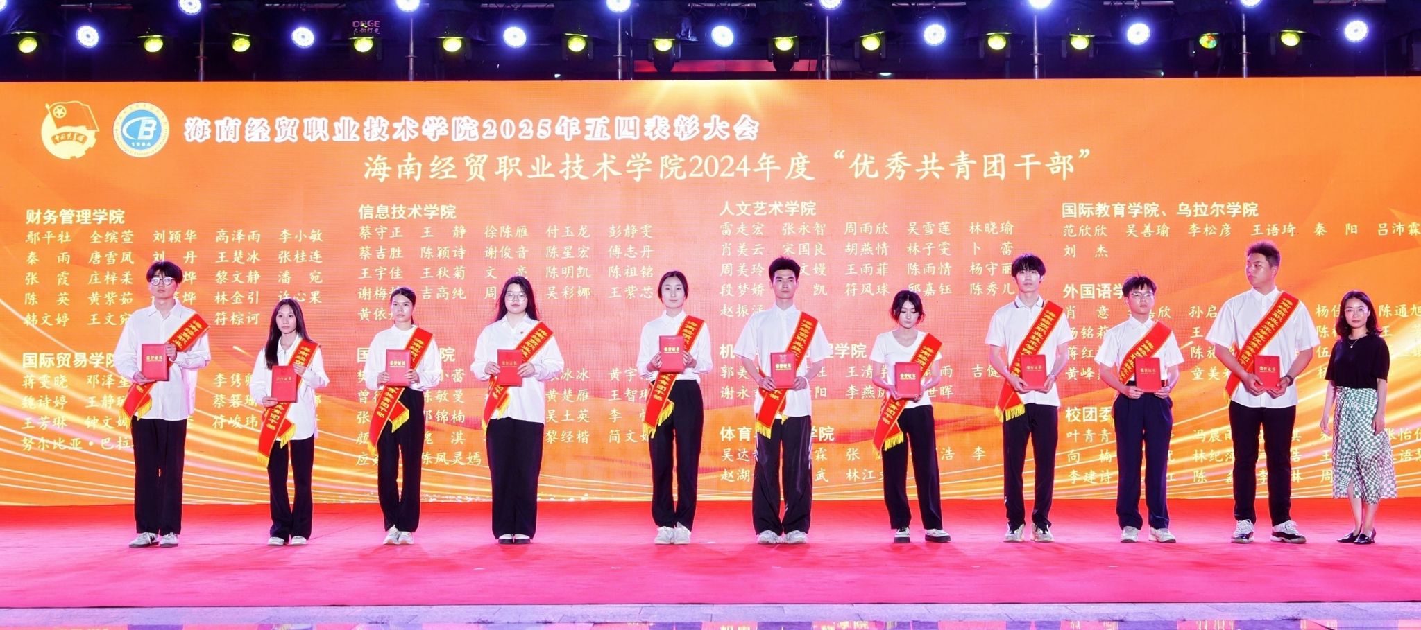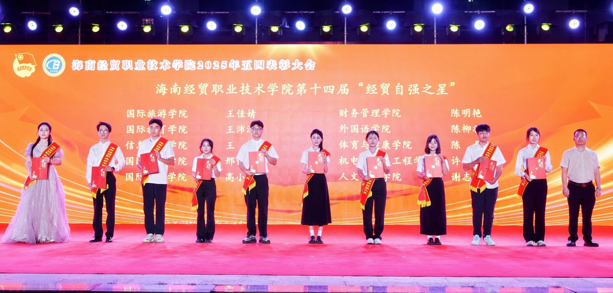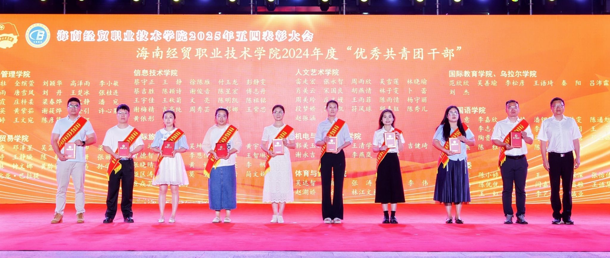 大会对过去一年取得突出成绩的集体和个人进行表彰。国际贸易学院团总支、国际旅游学院团总支、人文艺术学院团总支等3个团组织荣获“五四红旗团总支”,2023级大数据与财务管理正保班团支部等28个团组织荣获“五四红旗团支部”,鄢平牡等9名教师、高泽雨等159名同学荣获“优秀共青团干部”称号,吴绍丹等227名同学荣获“优秀共青团员”称号。王佳婧同学荣获第十四届“经贸自强之星标兵”称号,王沛泽等9名同学荣获第十四届“经贸自强之星”称号。