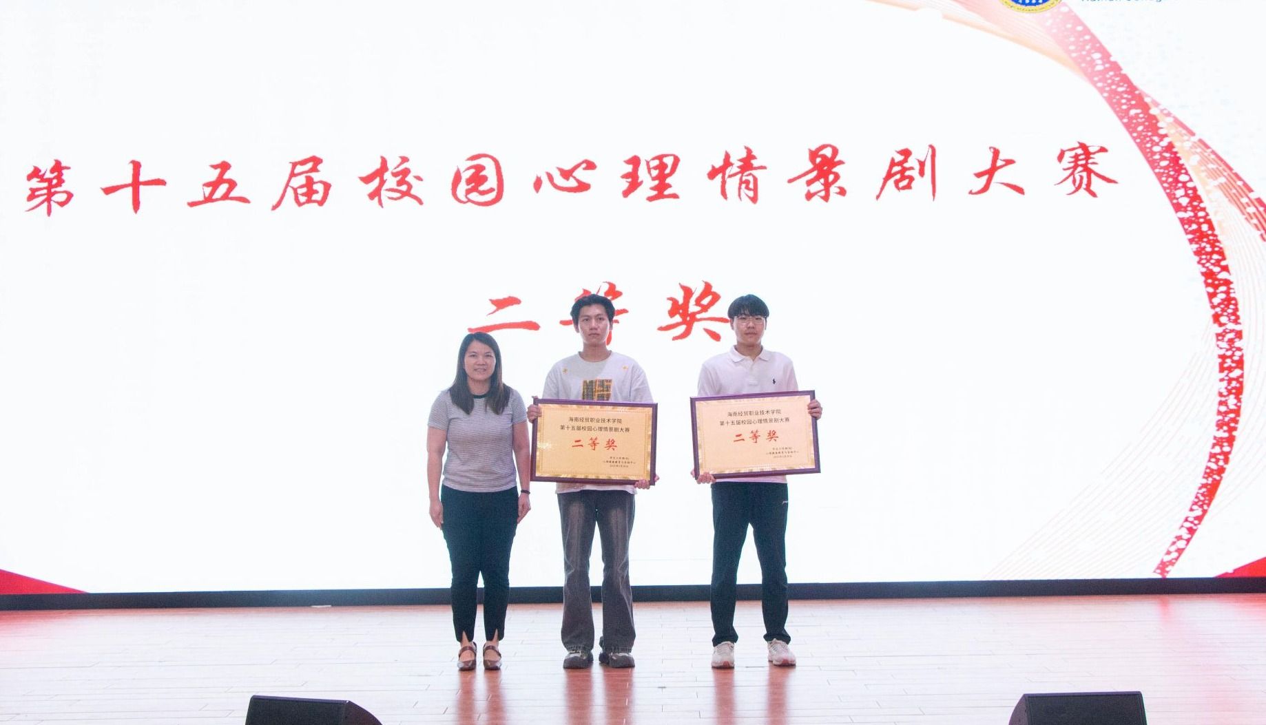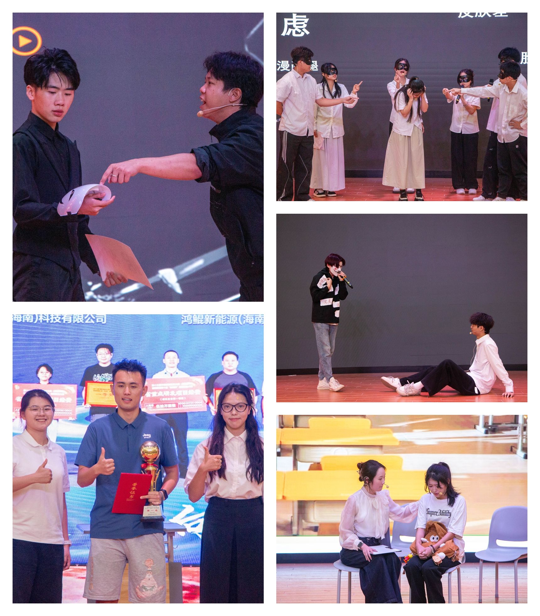 经专业评委综合评定,国际旅游学院剧目《面具之下》以细腻的情感表达和深刻的现实意义赢得高度评价,荣获一等奖;信息技术学院剧目《破茧》、国际教育学院和乌拉尔学院剧目《标签之外 寻光而行》获得二等奖;国际贸易学院剧目《心光引航创业路》、人文艺术学院剧目《理想之舟》获得三等奖。外国语学院、机电与汽车工程学院、财务管理学院、体育与健康学院的剧目获得优秀奖。大赛还评选出“最佳男演员”“最佳女演员”“优秀指导教师”等单项奖。