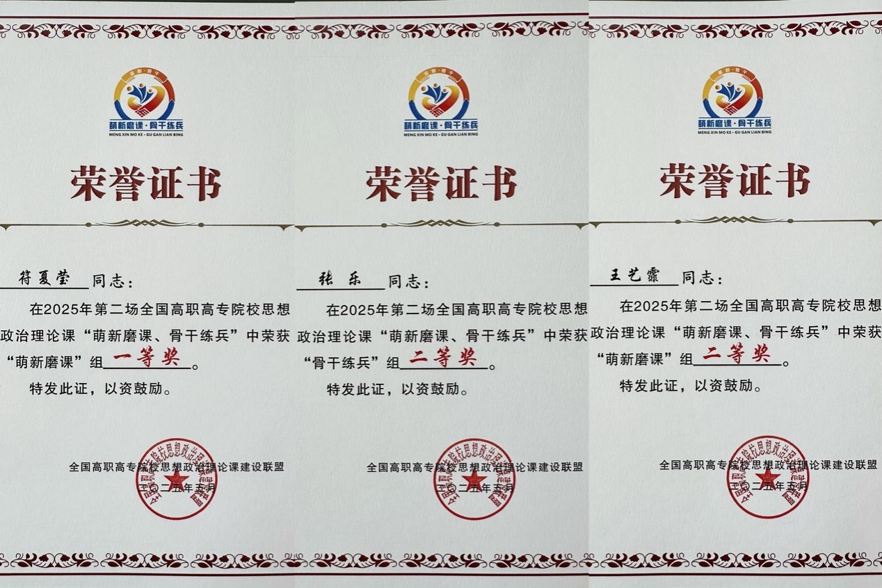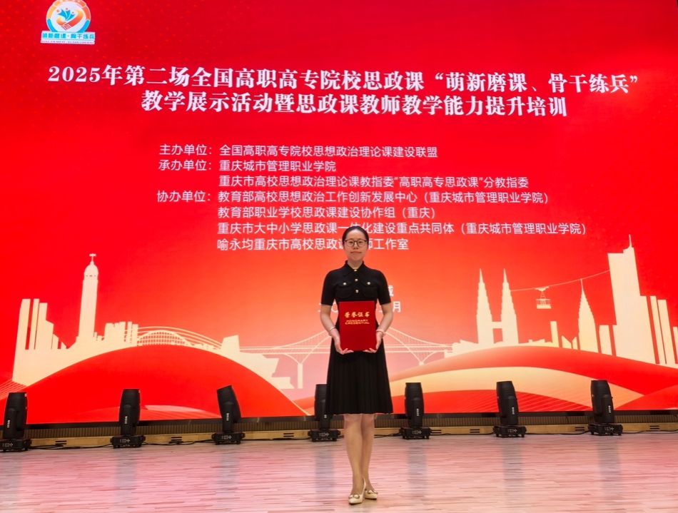 近日,2025年全国高职院校思想政治理论课第二场“萌新磨课、骨干练兵”教学展示活动在重庆落下帷幕。米兰milan官方网站马克思主义学院教师符夏莹获得“萌新磨课”组一等奖,王艺霏获得二等奖,张乐获得“骨干练兵”组二等奖。