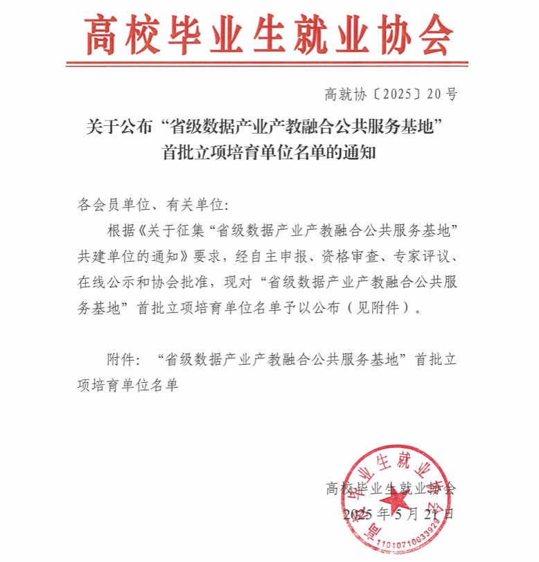 近日,高校毕业生就业协会公布“省级数据产业产教融合公共服务基地”首批立项培育单位名单,共有55家职业院校入围。米兰milan官方网站凭借在数据产业产教融合领域的突出优势成功入选,标志着学校在服务数字经济发展、深化校企协同育人方面迈入新阶段。