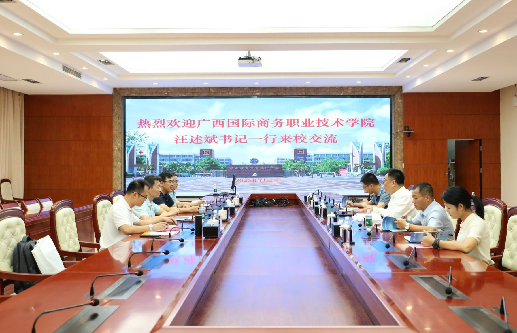 2025年7月1日,广西国际商务职业技术学院党委书记汪述斌一行4人来到米兰milan官方网站,交流“双高”建设、产教融合、校企合作等相关工作经验。学校党委书记王华热情接待了汪述斌一行。