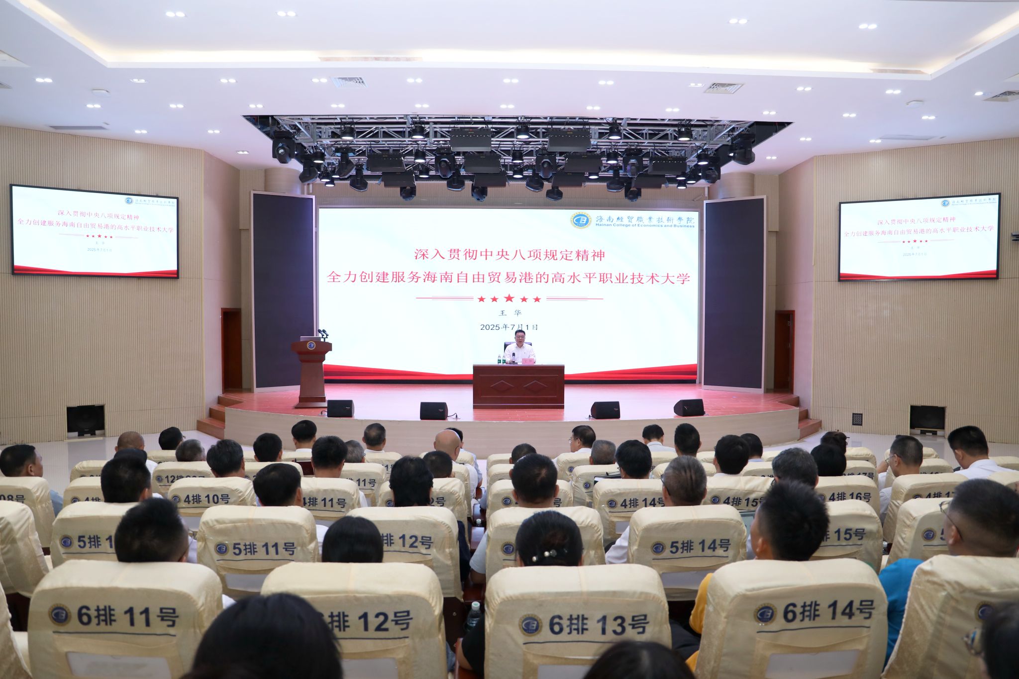 2025年7月1日是中国共产党成立104周年纪念日,海南经贸职业技术学党委书记王华为党员干部讲授深入贯彻中央八项规定精神学习教育专题党课。