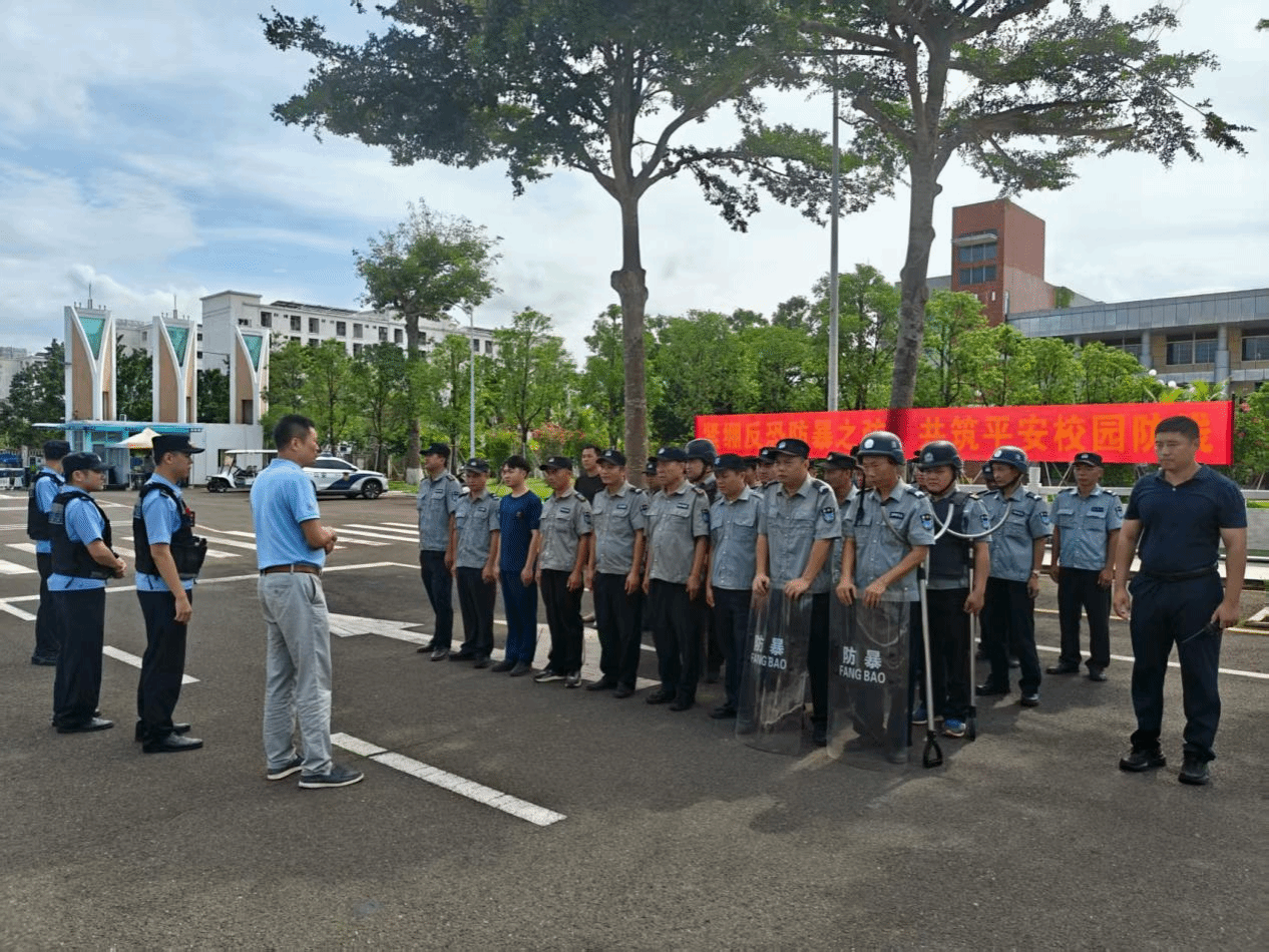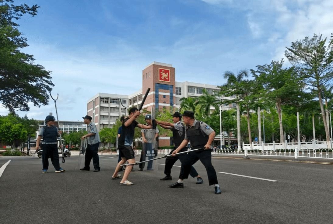 在实操环节,一名由安保人员扮演的 “歹徒” 持凶器试图闯入校园。安保人员发现后迅速启动应急预案,组成防暴处置小组,手持器材形成防御队形抵挡攻击,最终成功制服 “歹徒”。整个过程紧张有序,安保人员反应迅速、操作规范。