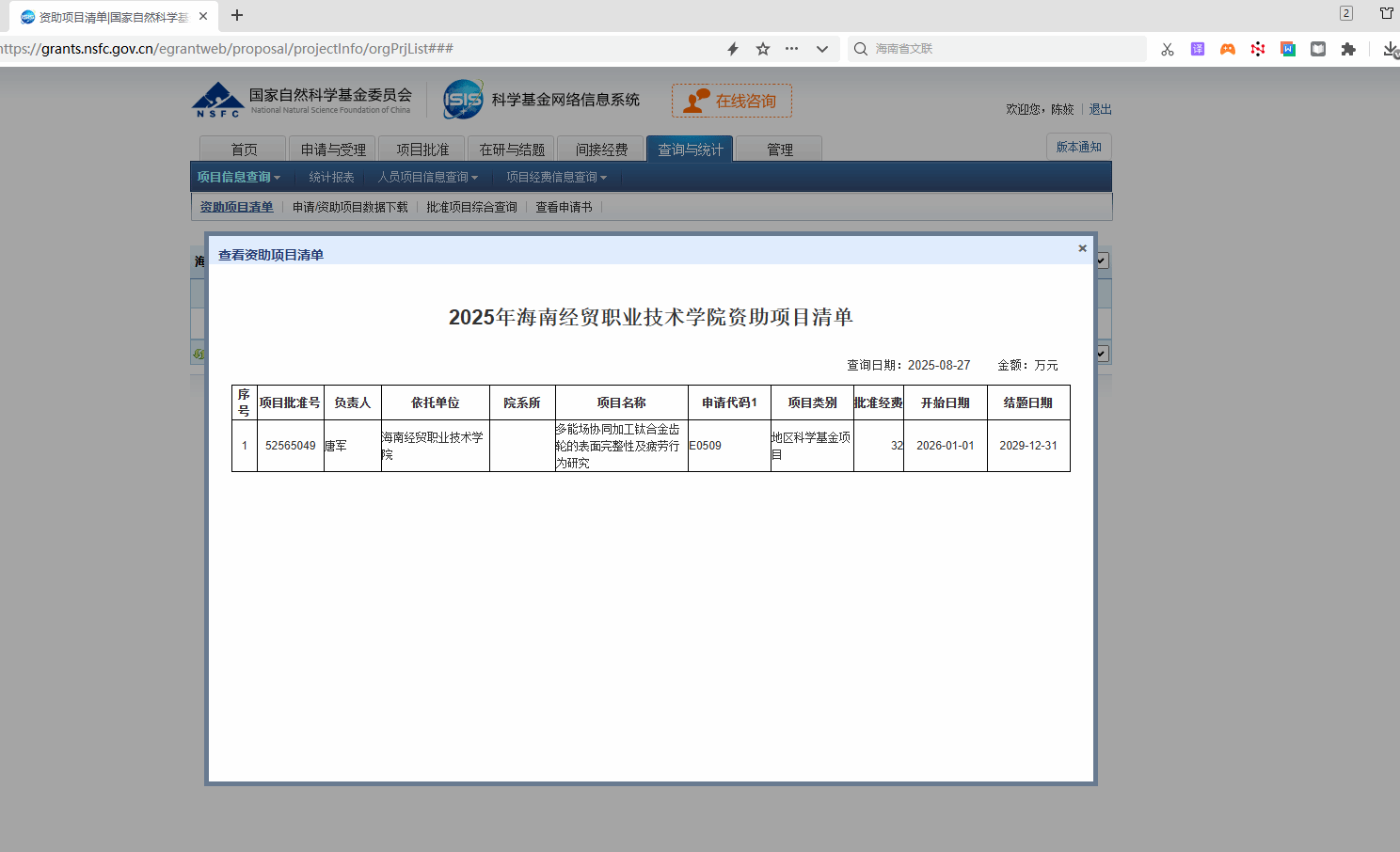 8月27日,国家自然科学基金委员会公布2025年国家自然科学基金集中接收申请项目评审结果。米兰milan官方网站唐军博士主持的项目《多能场协同加工钛合金齿轮的表面完整性及疲劳行为研究》成功获批2025年度国家自然科学基金地区科学基金项目,实现了学校在国家自然科学基金项目立项“零”的突破。