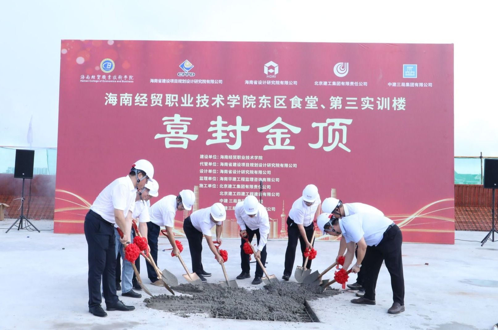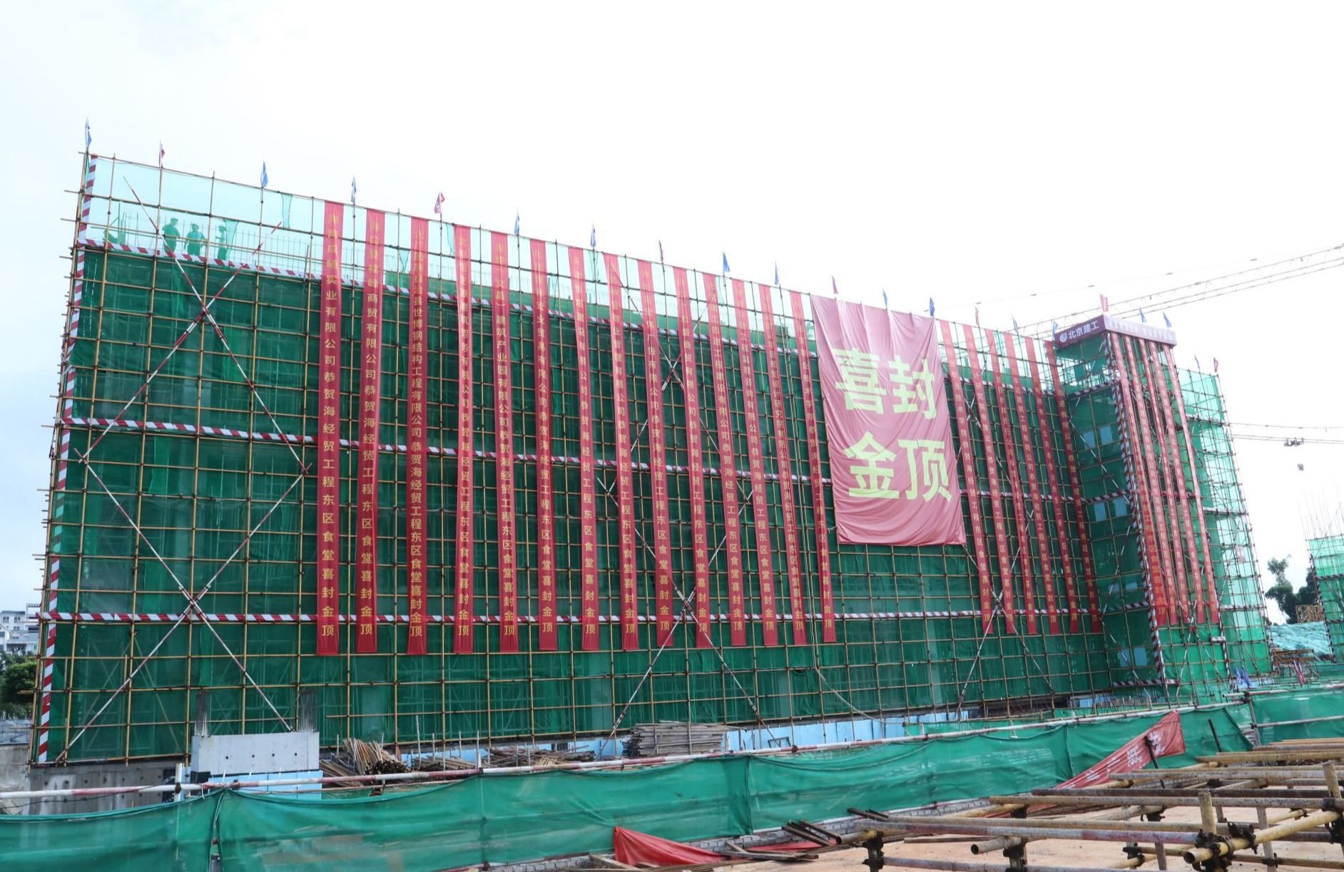 仪式上,学校和参建单位领导共同为工程最后一方混凝土浇筑,标志着东区食堂、第三实训楼主体结构顺利封顶,取得项目建设阶段性成果。