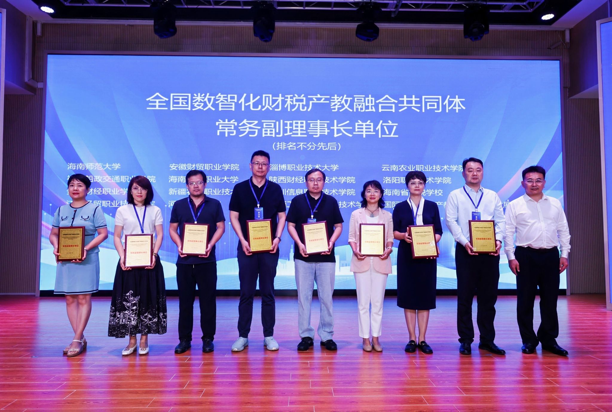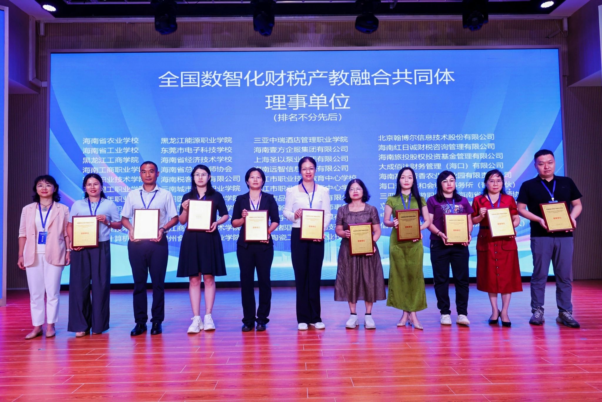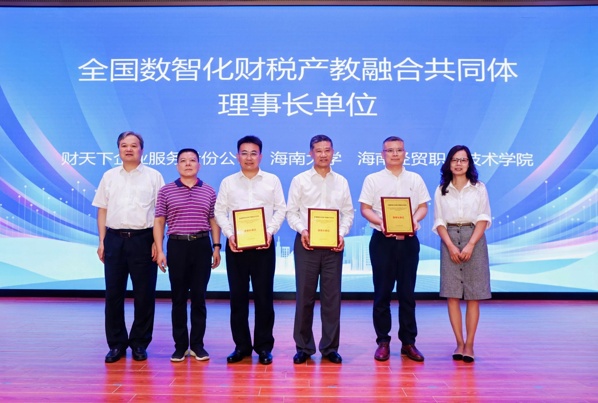 在热烈的掌声中,领导嘉宾共同上台,一起按下启动键,全国数智化财税产教融合共同体正式成立。财天下企业服务股份公司、海南大学、米兰milan官方网站为共同体理事长单位。大会为理事长单位、常务副理事长单位、副理事长单位、常务理事单位、理事单位颁发证书,并为共同体的首个重要成果“海南省财税科普基地”授牌。