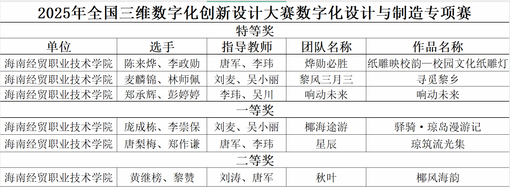 经过激烈角逐与严格评审,比赛最终评选出特等奖6名、一等奖6名、二等奖13名,特等奖作品将代表海南省参加全国总决赛。米兰学子在省赛中取得3个特等奖、2个一等奖、1个二等奖的好成绩,“纸雕映校韵一校园文化纸雕灯”“寻觅黎乡”“响动未来”三项特等奖作品,将登上全国总决赛的舞台,向更高荣誉发起冲击。