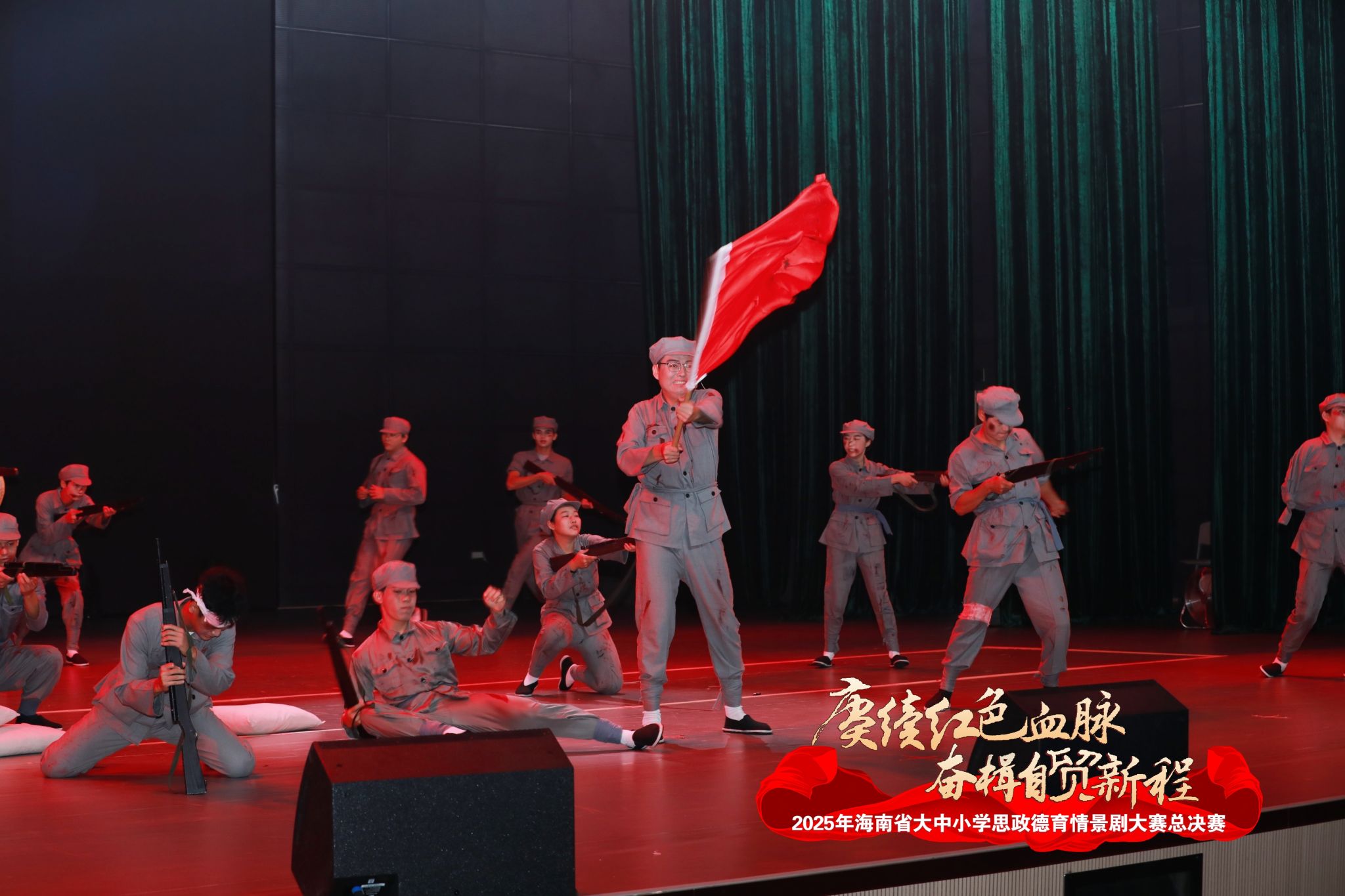 来自各二级学院的近30名师生历经一个多月刻苦排练、精心打磨,以精湛演绎在全省舞台绽放光彩。作品以抗日战争时期海南澄迈县老城镇朱献烈士 “绝不屈服母子英烈” 的事迹为原型改编。朱献投身琼崖抗日独立总队,带领安仁、东兴、白莲、老城四乡民众奋勇抗敌。日军为逼其投降,掳走他的母亲与妹妹。朱母深明大义,坚贞不屈,最终惨遭日军杀害。面对敌人的威逼利诱,朱献始立誓传承母亲遗训,继续抗敌御侮。这位英烈的墓碑上,“为人民而死,虽死犹荣”九个红色大字,镌刻着他的赤胆忠心。