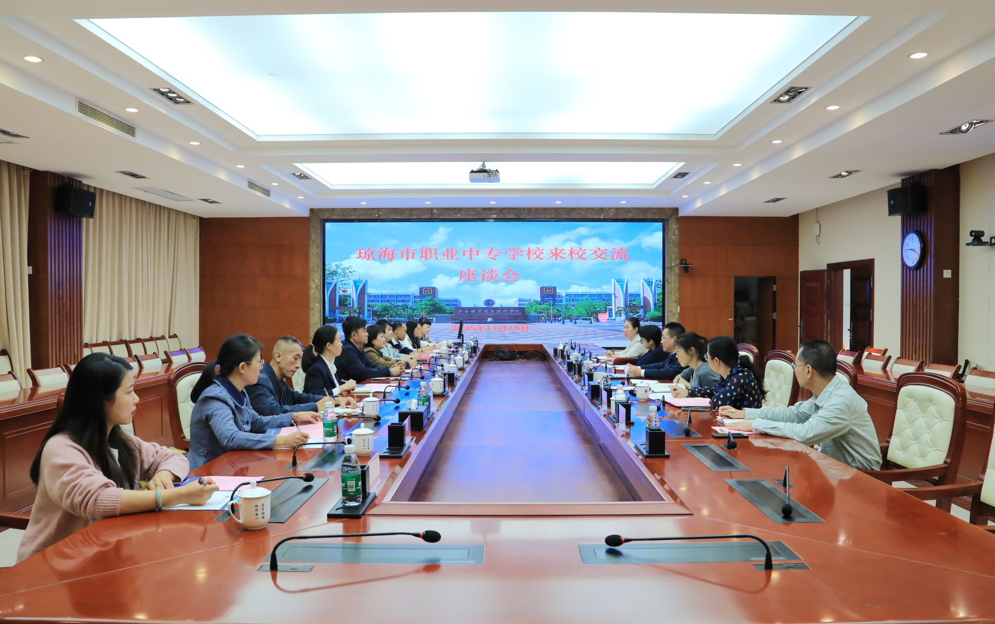 2025年11月18日,琼海市职业中等学校党委书记黄诚一行10人来到米兰milan官方网站,就“3+2”贯通培养项目合作办学事宜进行座谈。学校党委副书记、校长崔昌华,副校长杨娜热情接待了黄诚一行。