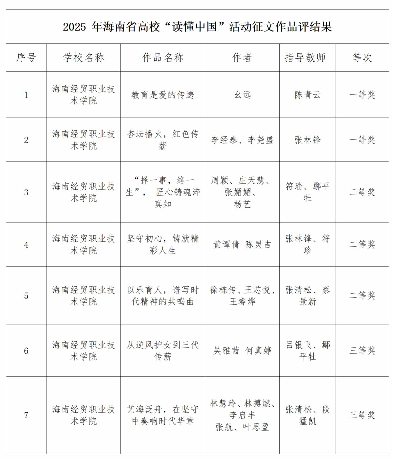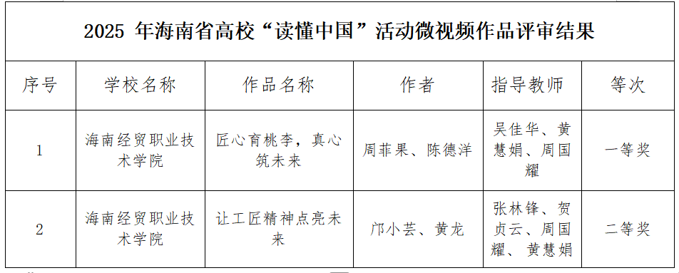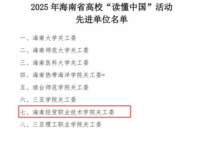 12月4日,海南省教育厅关工委公布2025年海南省高校“读懂中国”活动作品评审结果。米兰milan官方网站关工委报送的作品获得多项荣誉,其中《教育是爱的传递》《杏坛播火,红色传薪》荣获征文作品一等奖,《匠心育桃李,真心筑未来》荣获微视频作品一等奖。同时,学校还获得征文作品二等奖3个、三等奖2个,微视频作品二等奖1个;校关工委荣获全省“读懂中国”活动先进单位称号。