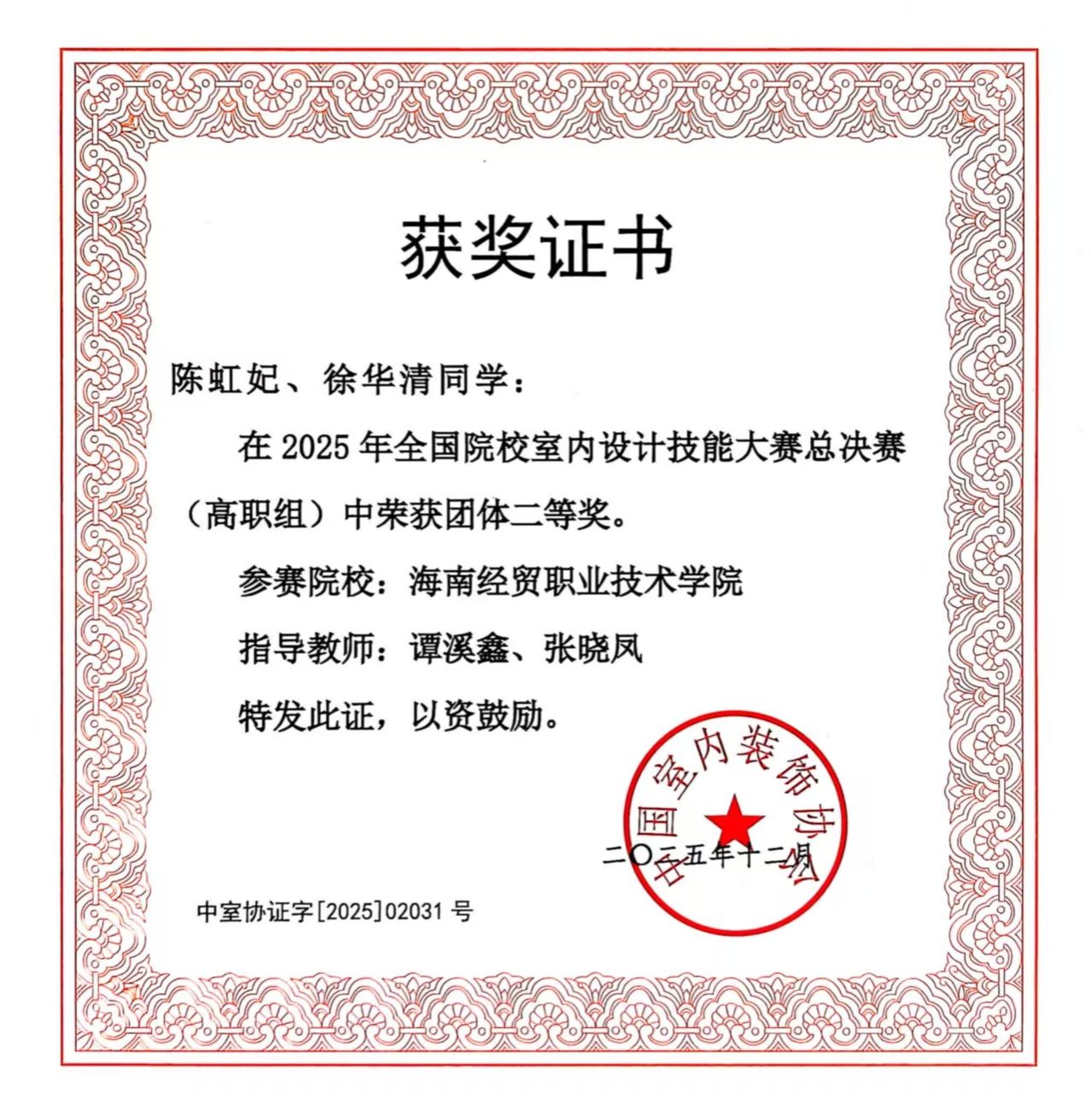 本届大赛由中国室内装饰协会主办,教育部职业院校艺术设计类专业教学指导委员会联合主办,上海工艺美术职业学院承办。总决赛为团体赛,每支队伍由2名选手组成,分设中职、高职和本科三个组别。赛题紧密对接室内装饰行业技术标准与产业发展趋势,以真实项目为载体,全面考核选手的设计思维、技术实现、团队协作与创新表达能力。大赛共有1300余支队伍报名参赛,覆盖29个赛区。在谭溪鑫、张晓凤以及姜可营三位老师的悉心指导下,陈虹妃、徐华清和陈友、张旭两个参赛团队凭借扎实的理论知识、卓越的设计才华、默契的团队合作和出色的现场表现,取得了竞赛好成绩,展现了米兰学子良好的精神风貌。