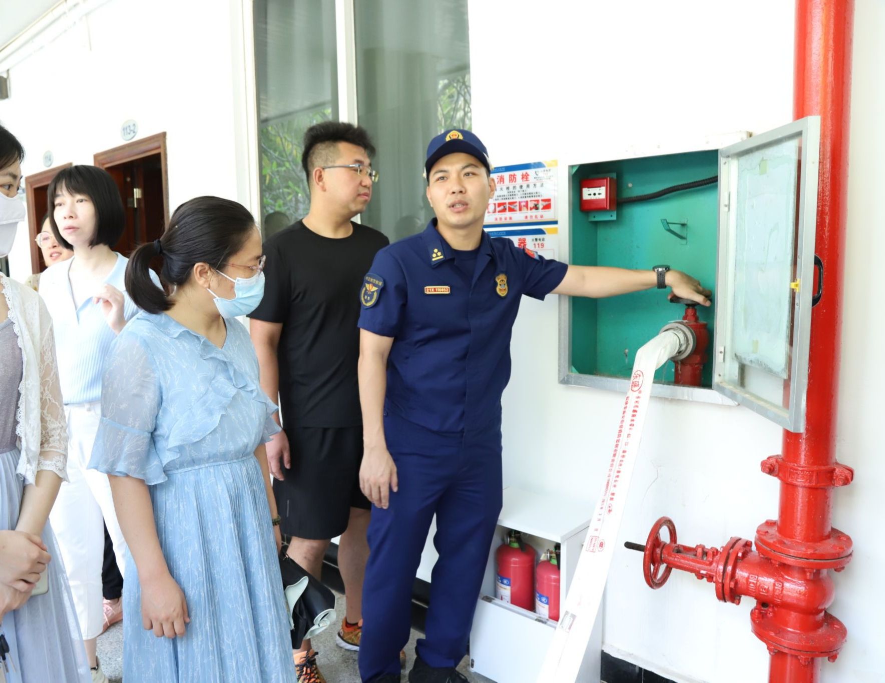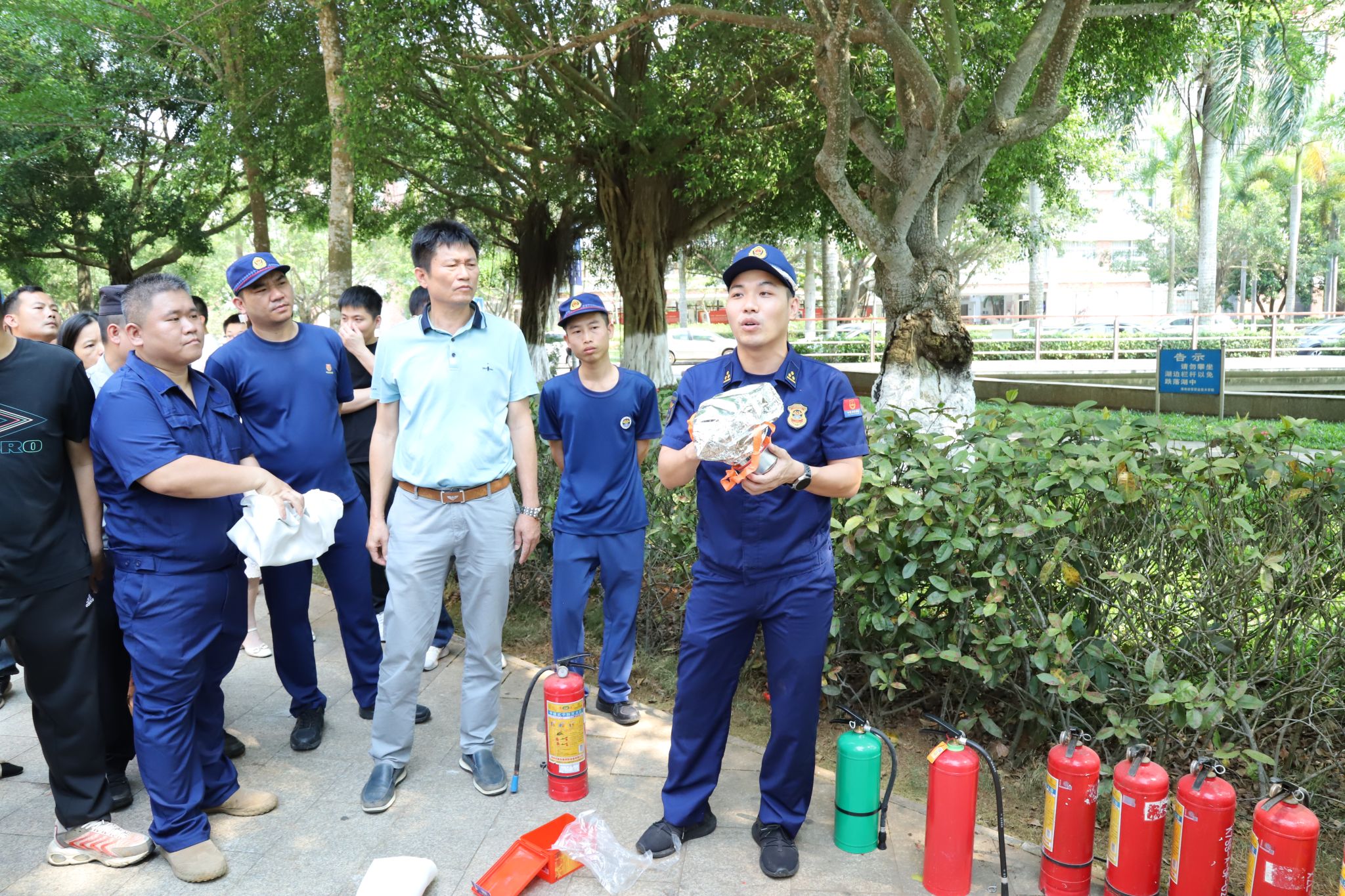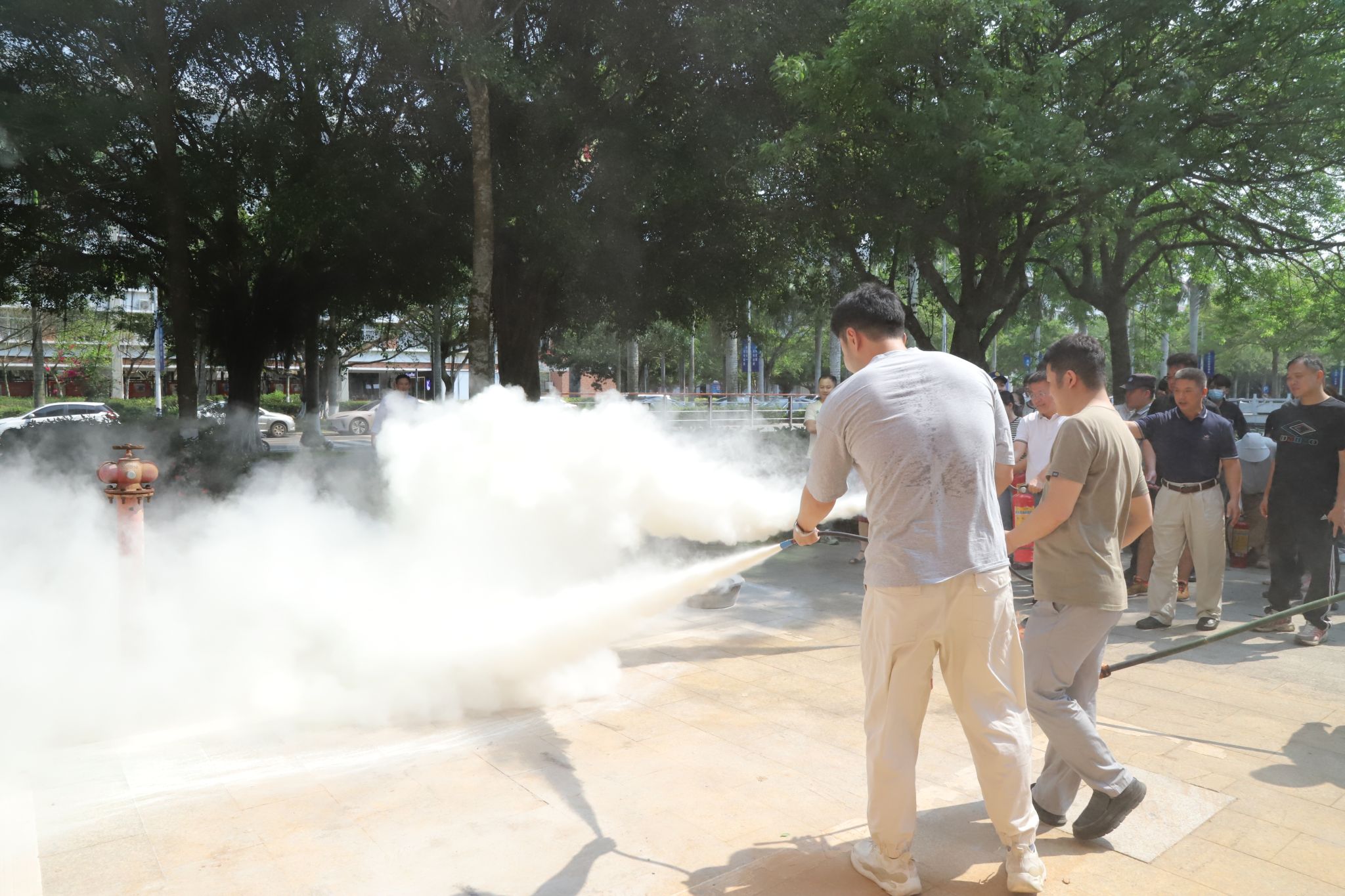 教职工认真倾听讲解员的消防知识培训,围绕校园、宿舍、办公区域防火灭火要点展开讨论,亲身感受并实际操作各种消防器材的使用,并在行政办公楼实地开展了灭火和逃生疏散演练。