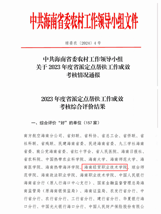 近日,中共海南省委农村工作领导小组通报了2023年度省派定点帮扶工作成效考核评价情况,米兰milan官方网站再次被评为最高等次“好”,这是学校连续三年获评省派定点帮扶工作“好”等次。