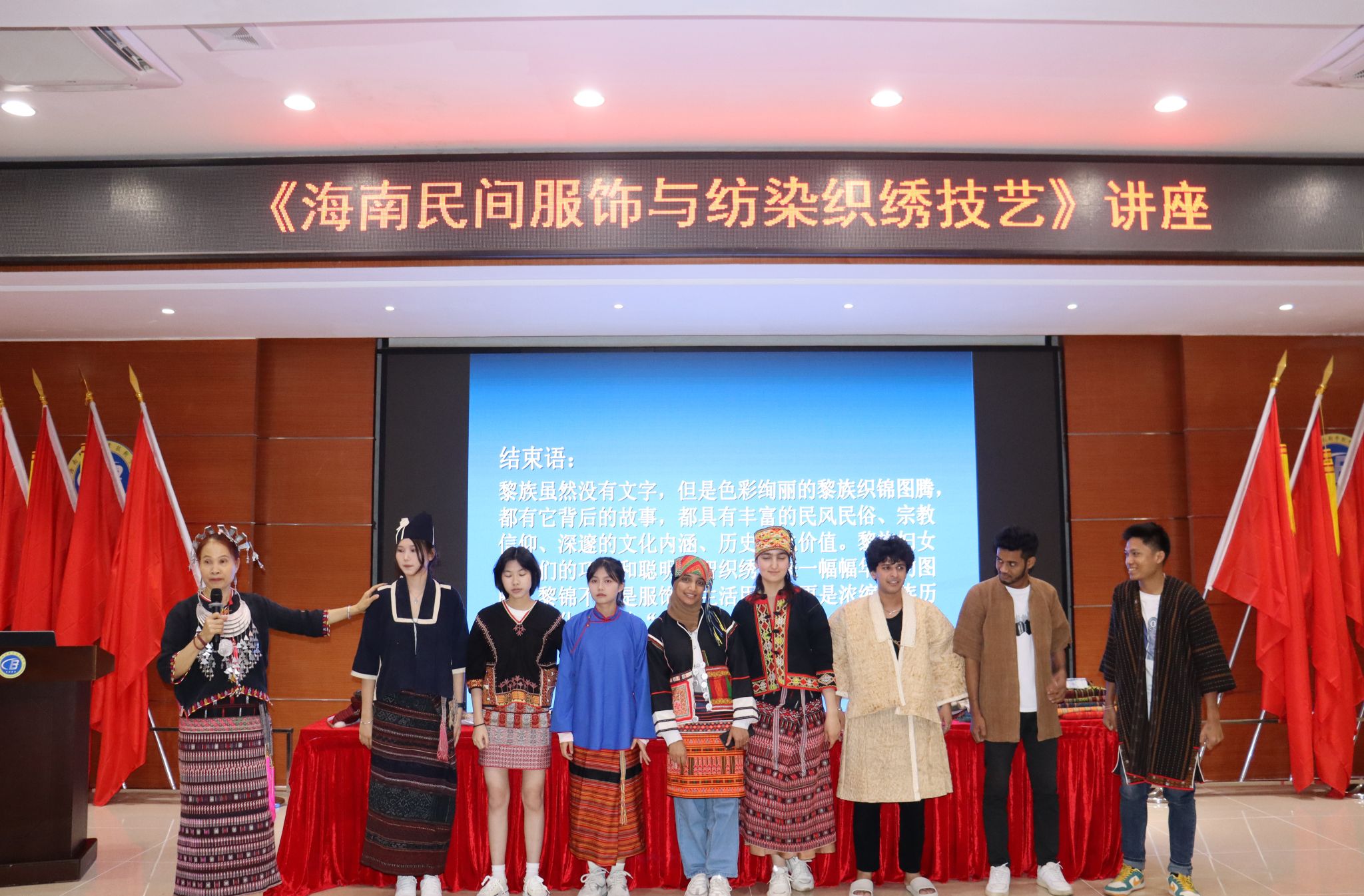 近日,海南省“南海工匠”“拔尖人才”、省级黎锦技艺传承人、米兰milan官方网站“陈丹技能大师工作室”负责人陈丹应邀来到学校,为中外学生带来了一场精彩的“海南民间服饰与纺染织绣技艺”讲座。