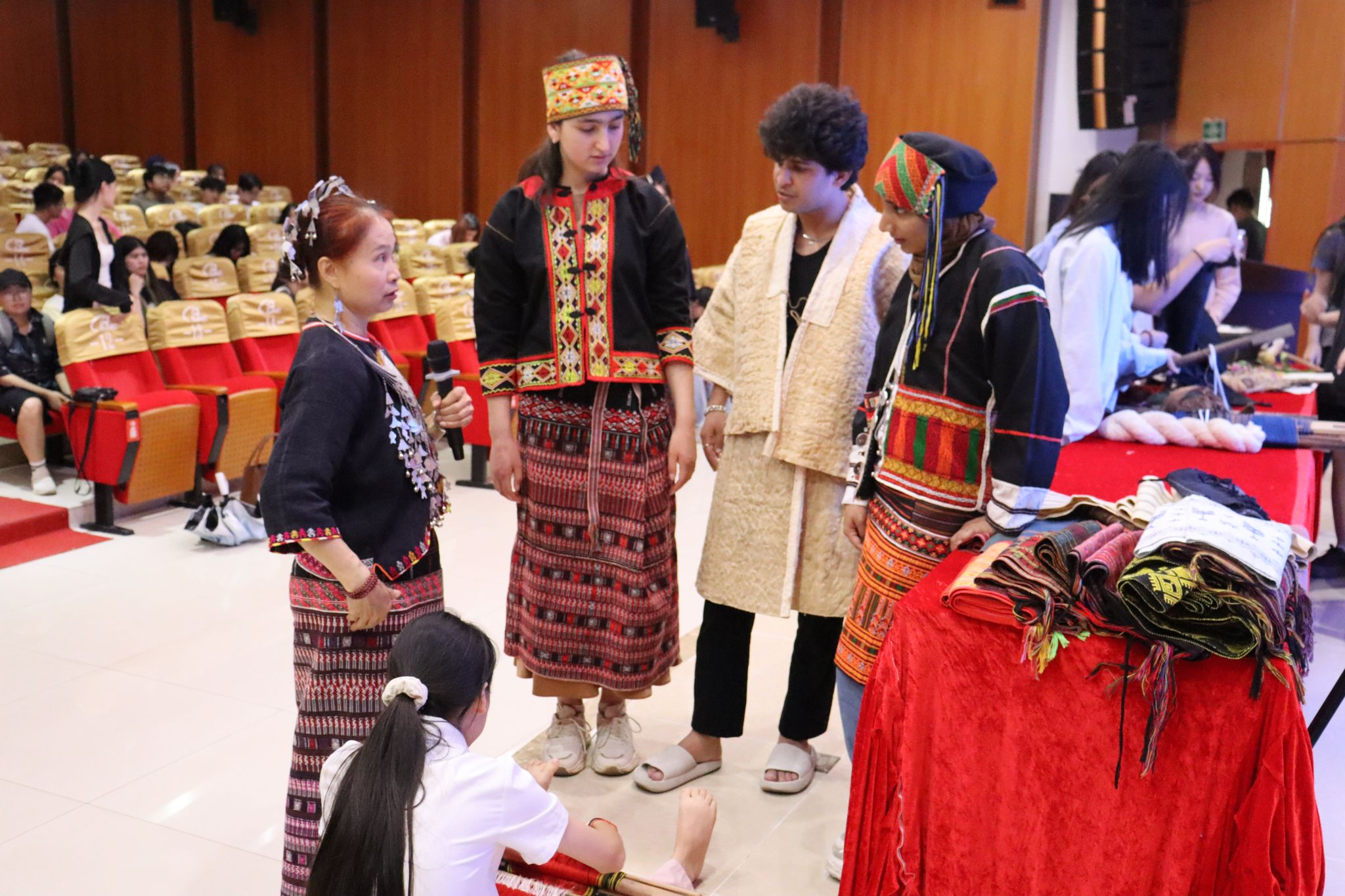 树皮衣、龙被、黎族五大方言区妇女的传统服饰……色泽艳丽、图案精美,承载着黎族深厚文化内涵的服饰和织物的现场展示,将讲座气氛推向高潮。同学们纷纷换装拍照,亲身感受独特的黎族民族文化魅力,体验黎锦织造技艺与纺线技艺,兴致勃勃,不亦乐乎。