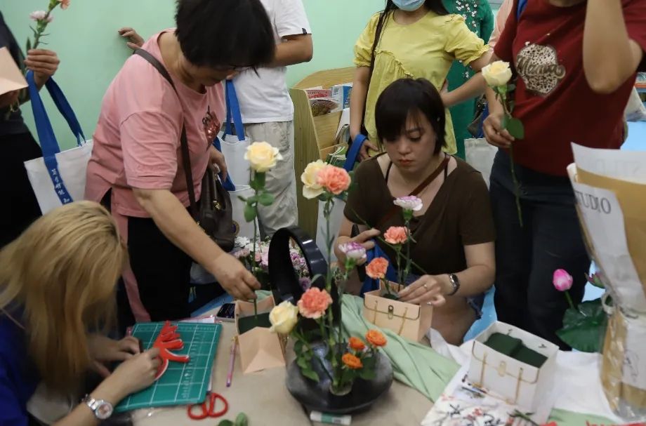 “学会这项技能可以提升我们的美感、陶冶情操、享受生活的美好。”人文艺术学院杨家文等同学们带来了康乃馨、玫瑰、雏菊、向日葵、满天星、彩带、 包装纸、花泥、纸扇等材料,在社区居民的共同参与下,五颜六色的花束、花篮,一件件精美的插花和剪纸作品纷纷亮相。“来这里体验插花能让人心情变好!”居民朋友们说。