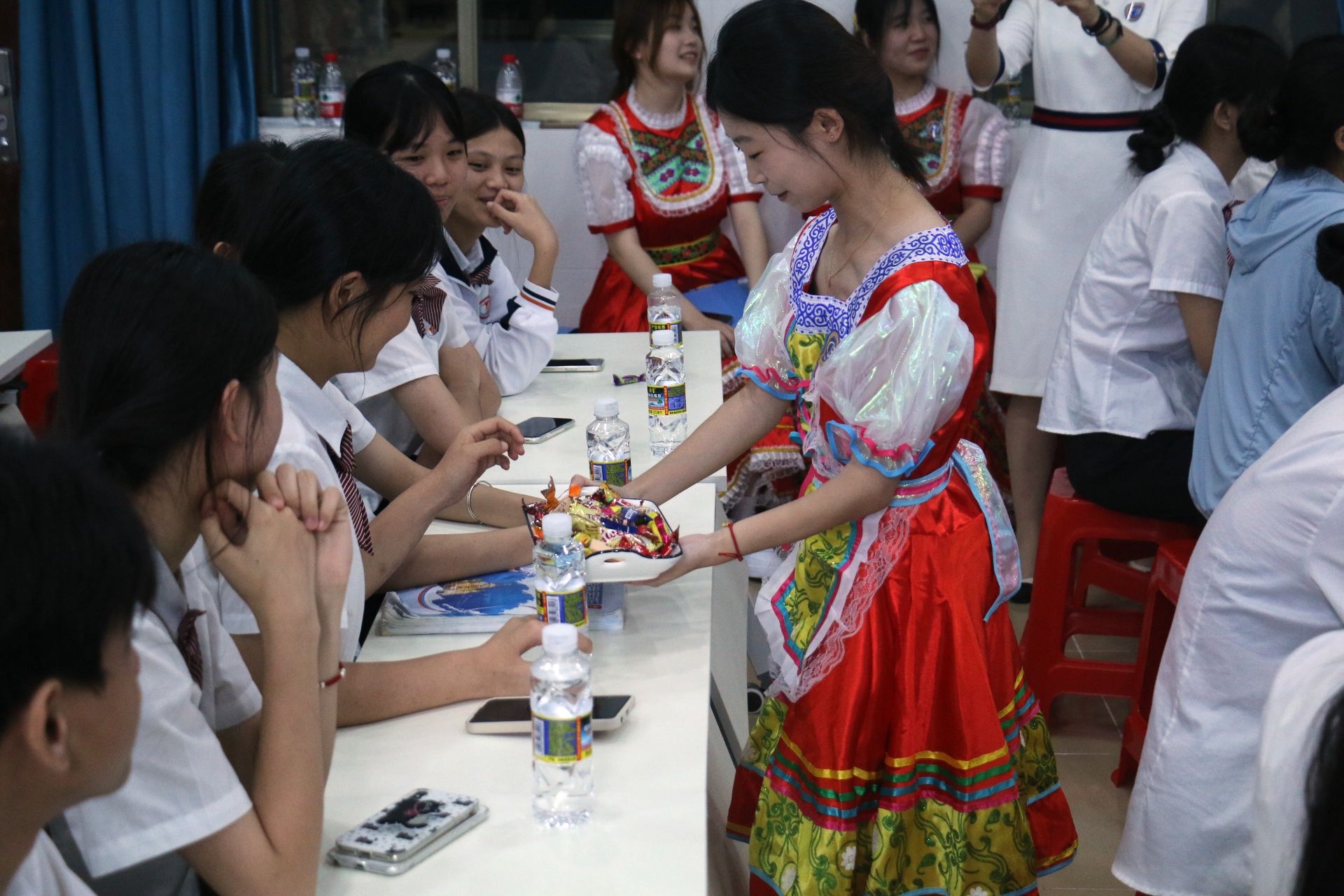 国际教育学院的学长学姐们正在进行“双语旅游线路策划竞赛”的比拼,流利的双语表达令人瞩目,载歌载舞的表演带给观众们独特新颖的感官体验。海口旅游职业学校的学弟学妹们也融入到了每个线路策划团队中。大家积极互动,进行游戏和问答闯关,各团队的活动丰富有趣,包括脑筋急转弯、单词对对碰、看图猜民族、单词接龙等游戏。大家参与其中,获取“通关印章”。