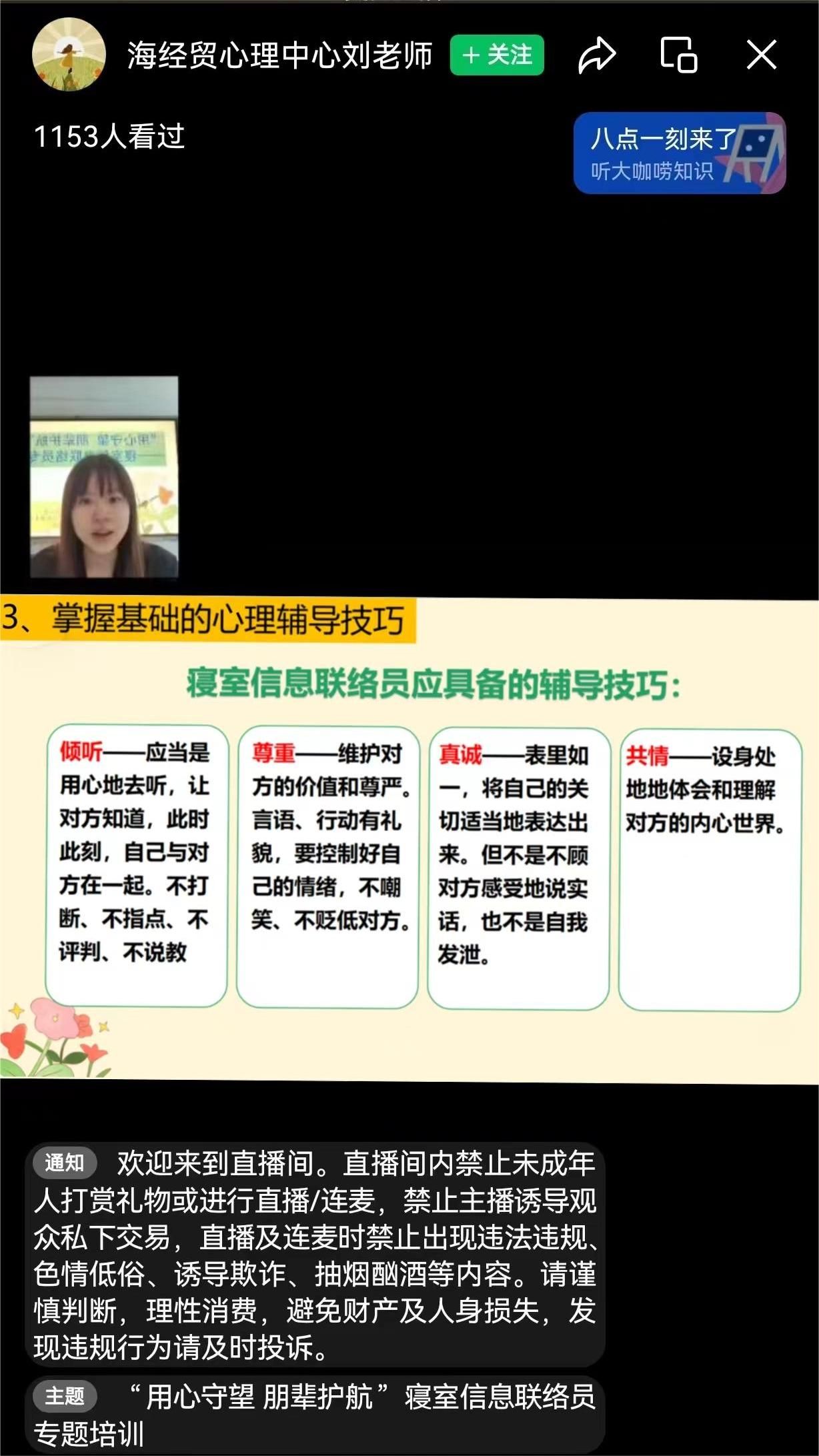 会议强调,寝室信息联络员是构建大学生健康心理育人环节不可或缺的一员,要充分发挥朋辈心理辅导的正向引导作用。培训会从寝室信息联络员的角色定位和工作职责、发现与识别常见心理问题、掌握基础的心理辅导技巧等方面普及相关心理健康知识,对异常心理的识别、常见心理问题的区分等方面做了详细讲解,鼓励各寝室信息联络员对待室友做到倾听、接纳、理解,对待他人危机事件做到报告、求助、陪伴。