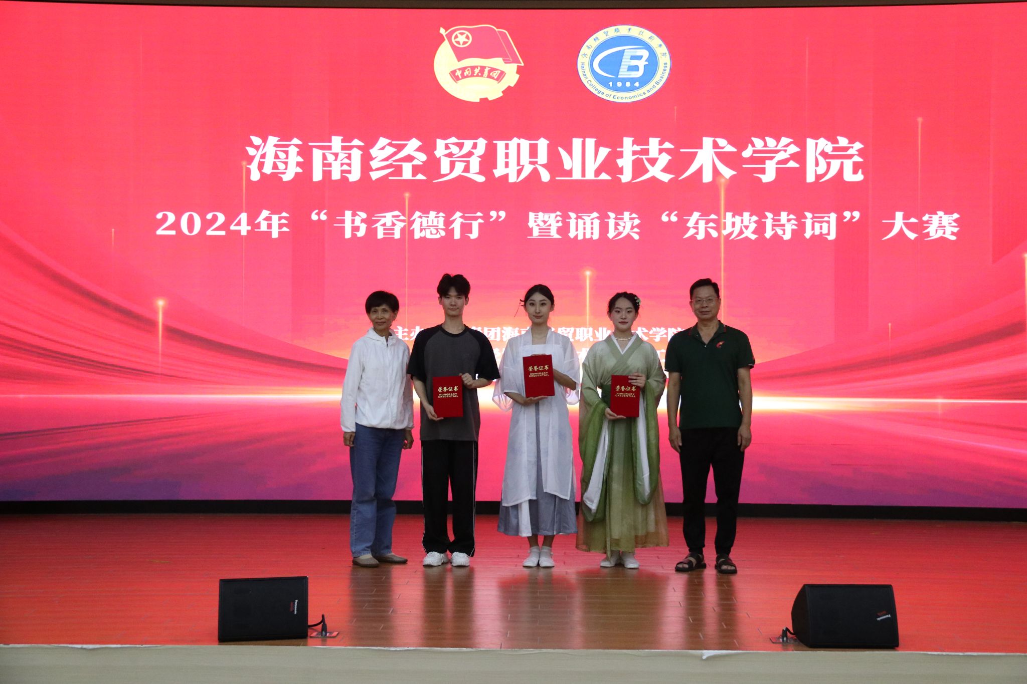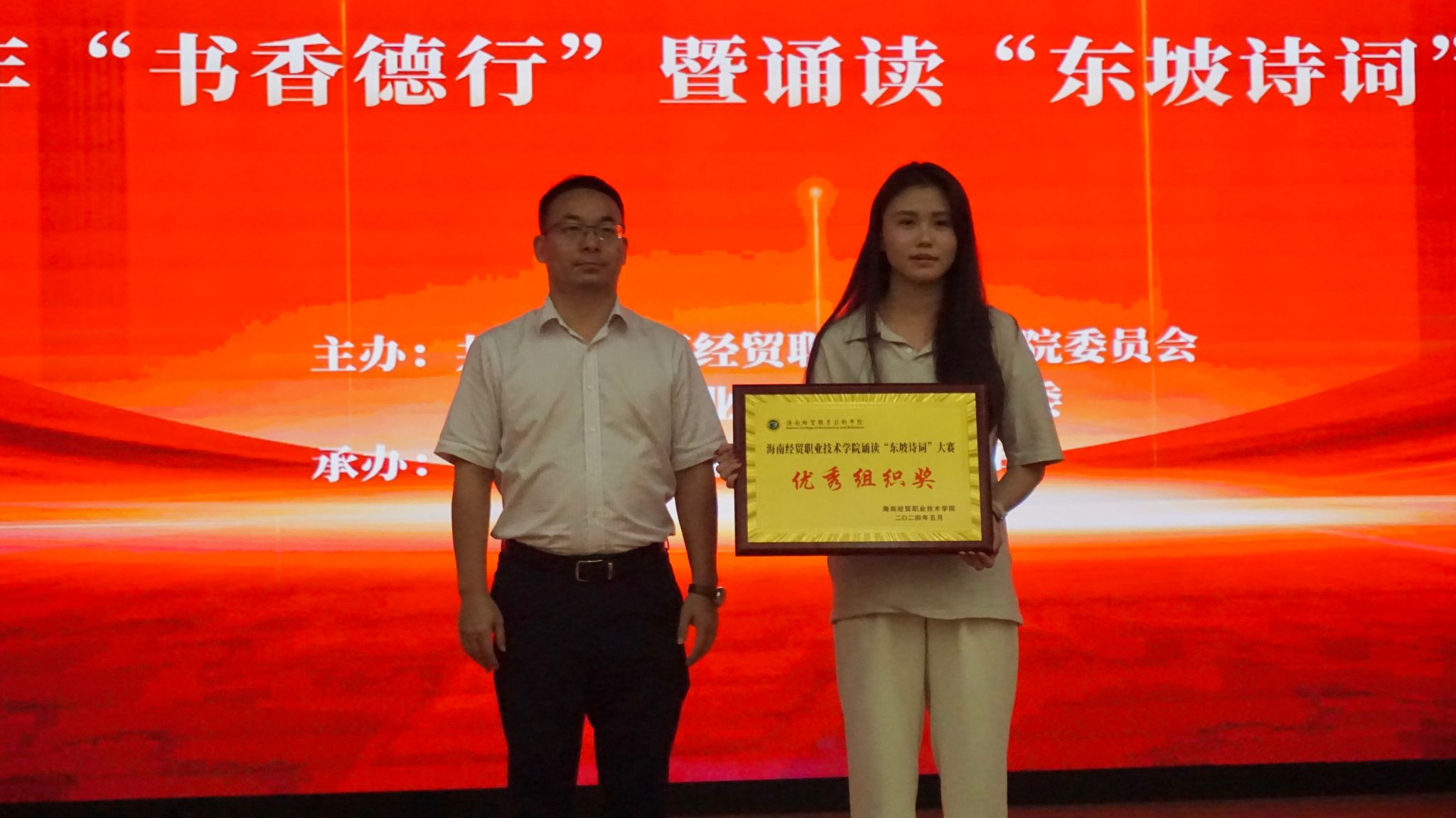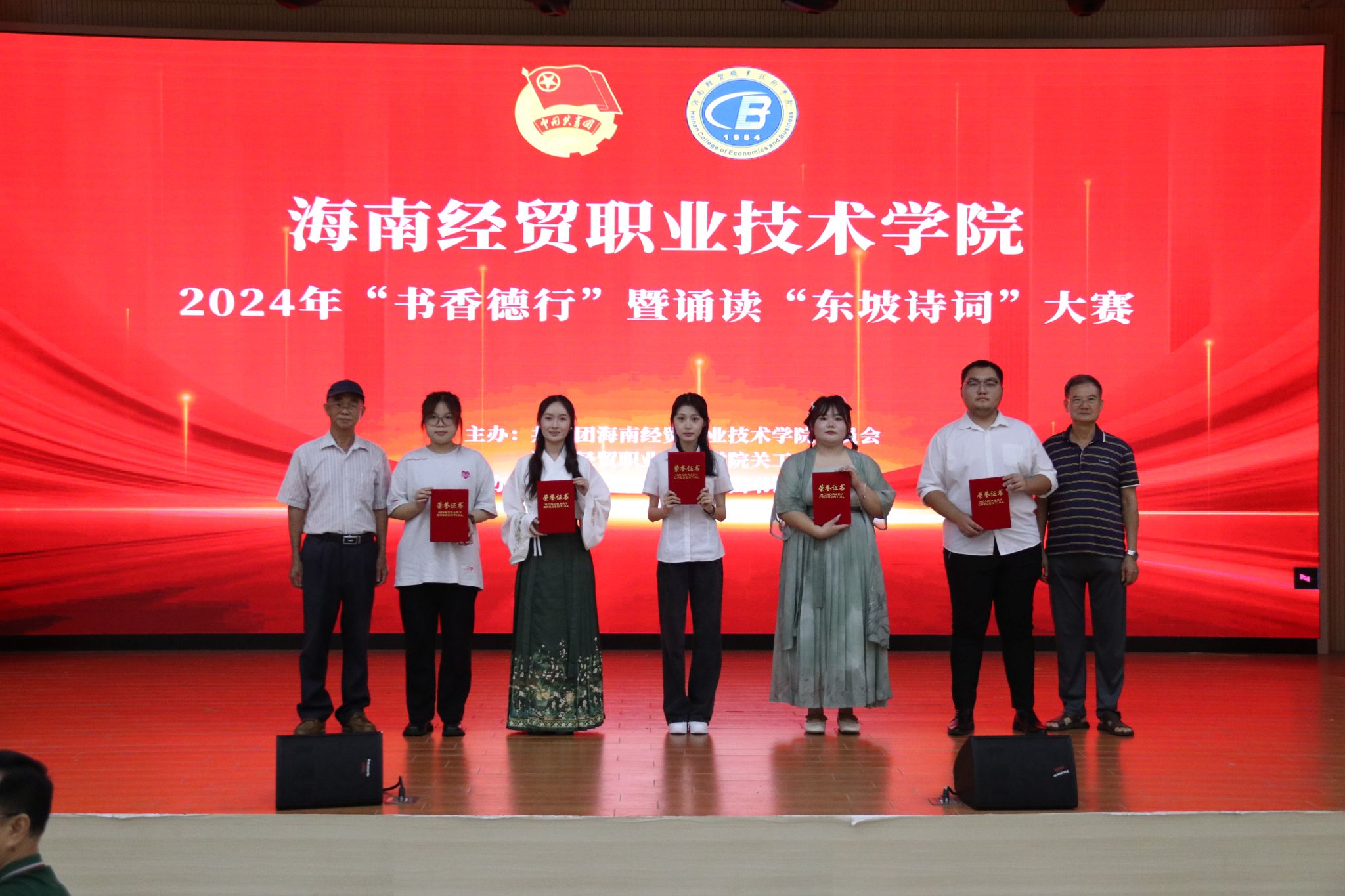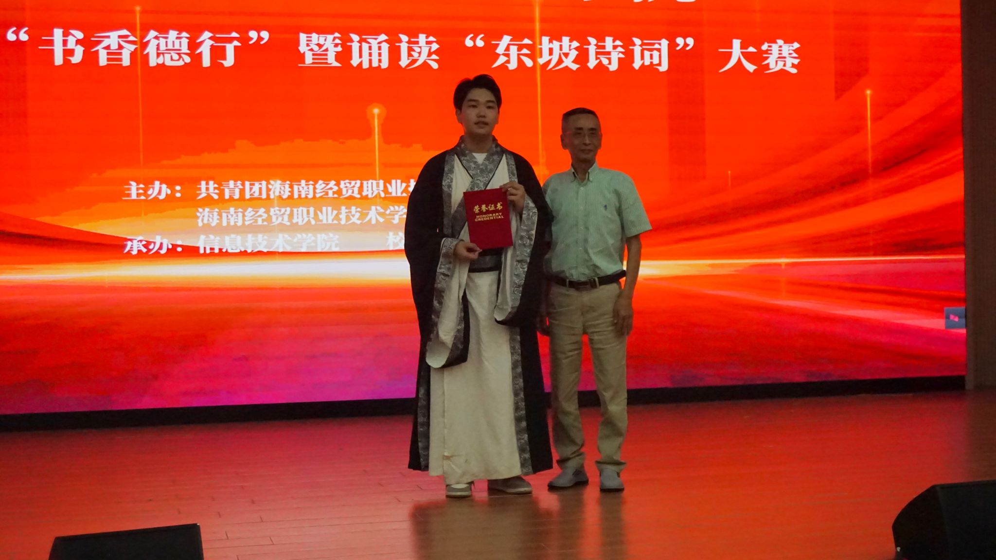经过现场激烈角逐,信息技术学院选送的作品“南海之畔,东坡之歌”获得一等奖;校团委选送的作品“正月二十忆无妻”“水调歌头”,财务管理学院选送的作品“梦回儋耳· 诗忆东坡”获得二等奖;校团委选送的作品“水龙吟”、国际旅游学院选送的作品“翰墨传情· 情寄东坡”、国际贸易学院选送的作品“来海南,在海南,离海南”、国际教育学院选送的作品“定风波·千年之缘”、人文艺术学院选送的作品“减字木兰花·已卯儋耳春词”获得三等奖;信息技术学院荣获优秀组织奖。