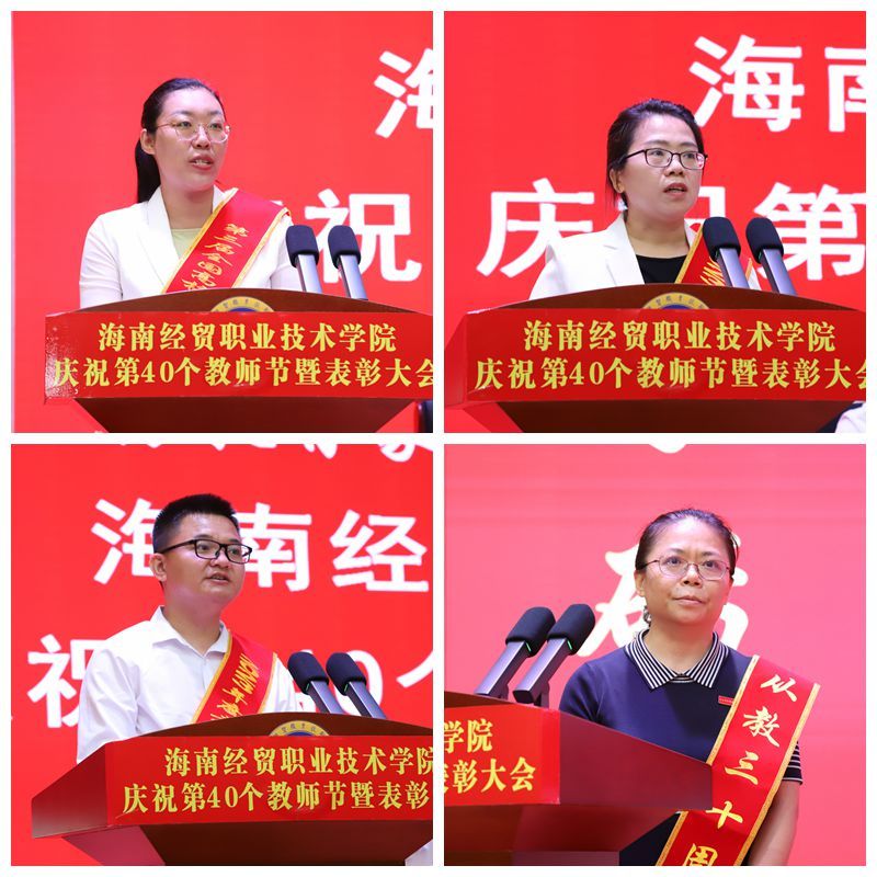 “作为教师,要为学生的成长和学校的教育事业发展作贡献,在工作中弘扬教育家精神,用实际行动践行‘为人师表’的职业精神,筑牢‘为党育人、为国育才’的使命担当。”2023年全国高校思想政治理论课教学展示活动评选一等奖获得者、马克思主义学院教师常彩霞,国家社会科学基金一般项目课题组负责人、人文艺术学院教师梁云云,省级党建工作样板支部负责人、2023年度考核优秀辅导员代表丁菁华,从教三十年教师代表、国际贸易学院教授林华瑾分别作为教师代表交流发言。他们围绕自己的工作岗位和从教体会,分享了自己在教育、教学、科研等领域取得的成绩和作为一名人民教师的深切感悟。