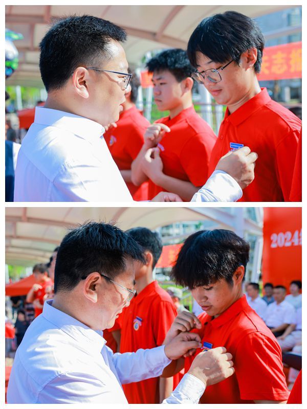 典礼上,王华、崔昌华为新生代表佩戴学校徽章。徽章熠熠生辉,承载着“笃学砺能、知行合一”的校训精神,见证着新一代米兰学子开启他们的梦想之旅,勇往直前,迈向光明未来。