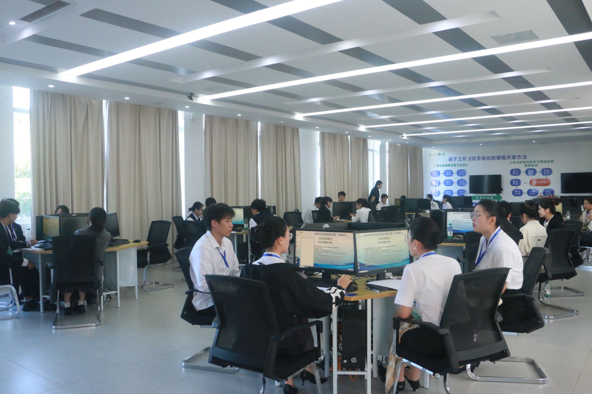 “加油!不要放弃!就差一点了!”在体育活动设计与实施赛项现场,加油鼓劲的声音,此起彼伏,参赛选手们个个精神饱满,斗志昂扬,尽情展示着青春与活力;自信满满,条理清晰,在智慧物流赛项现场,选手们以充分的准备汇报着各自队伍的设计方案;专心致志,聚精会神,在云计算运用赛项中,选手们需要运用所学知识,解决复杂的实际问题;头脑如风,思维敏锐,在视觉艺术设计赛场上,选手们正展开一场头脑风暴,为评委和观众带来一场视觉盛宴……比赛过程中,选手们不仅展示了高超的技能水平,还体现了良好的团队协作精神和应对突发情况的能力。
