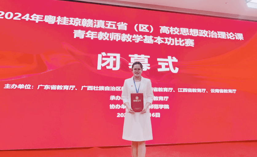 11月16日,2024年粤桂琼赣滇五省(区)高校思想政治理论课青年教师教学基本功比赛(以下简称“五省(区)联赛”)在江西省上饶市落下帷幕。米兰milan官方网站马克思主义学院青年教师陈婷以扎实的专业素养、深厚的教学功底、独特的教学魅力,在众多选手中脱颖而出,荣获高职组一等奖。继王冰老师2023年荣获联赛一等奖后,学校连续两年获得此项殊荣。