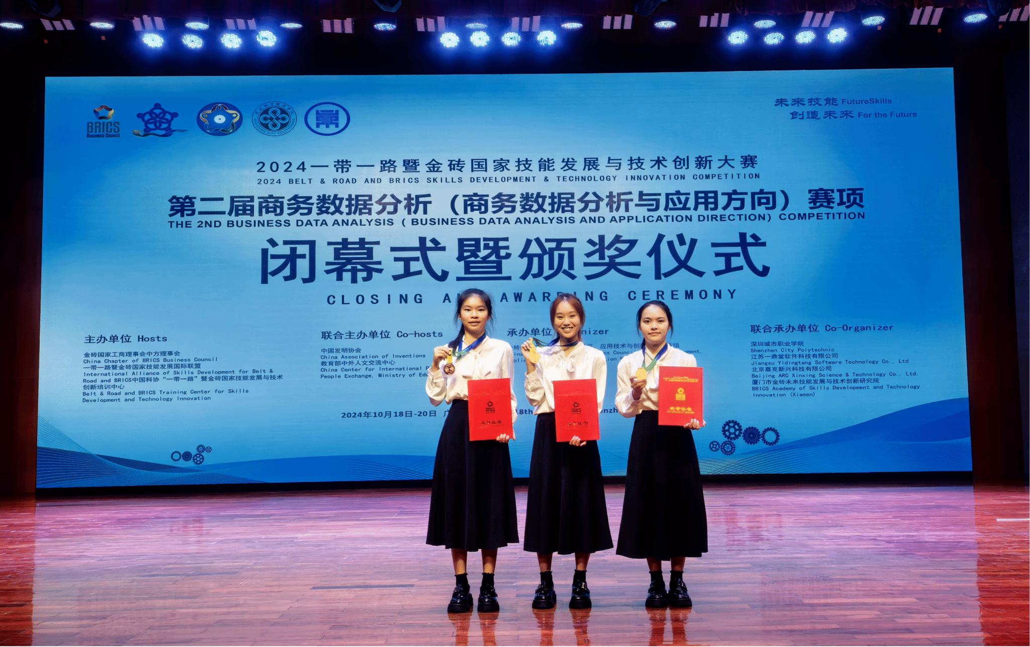 2024一带一路暨金砖国家技能发展与技术创新大赛举行。米兰milan官方网站财务管理学院学生刘容秀、黄贺、吴心怡组成的参赛团队荣获第二届商务数据分析(商务数据分析与应用方向)赛项高职组全国三等奖;苏晓亮荣获AI与大数据金融服务赛项高职组全国二等奖。▼