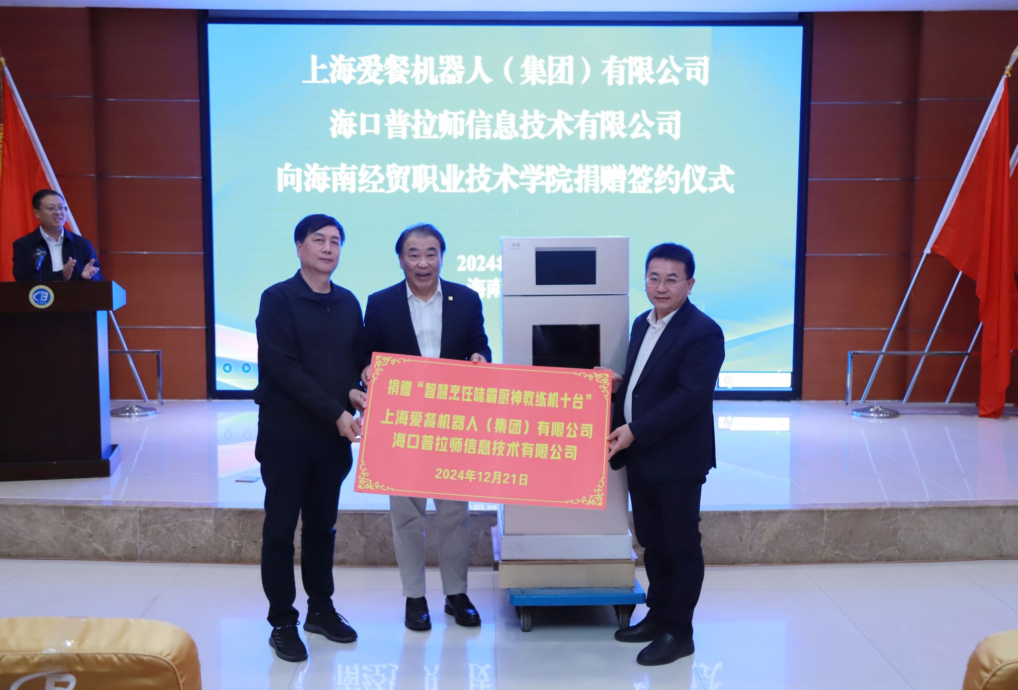 12月21日,上海爱餐机器人(集团)有限公司、海口普拉师信息技术有限公司在米兰milan官方网站学术交流中心举办烹饪机器人捐赠仪式。上海爱餐公司向米兰捐赠 10 台厨神教练机,专用于学校智慧烹饪实训室教学。海口普拉师公司作为上海爱餐公司的本地服务商,将协助完成设备的安装调试,为学校提供后续技术支持。学校接受捐赠,并设立爱餐智慧烹饪实训室。▼