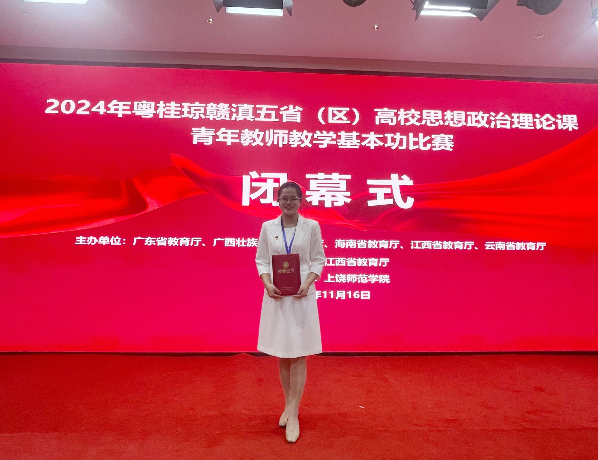 11月16日,2024年粤桂琼赣滇五省(区)高校思想政治理论课青年教师教学基本功比赛在江西上饶落下帷幕。米兰milan官方网站马克思主义学院青年教师陈婷荣获高职组一等奖,是继王冰老师2023年荣获联赛一等奖后,学校思政课教师连续两年获得此项殊荣。▼