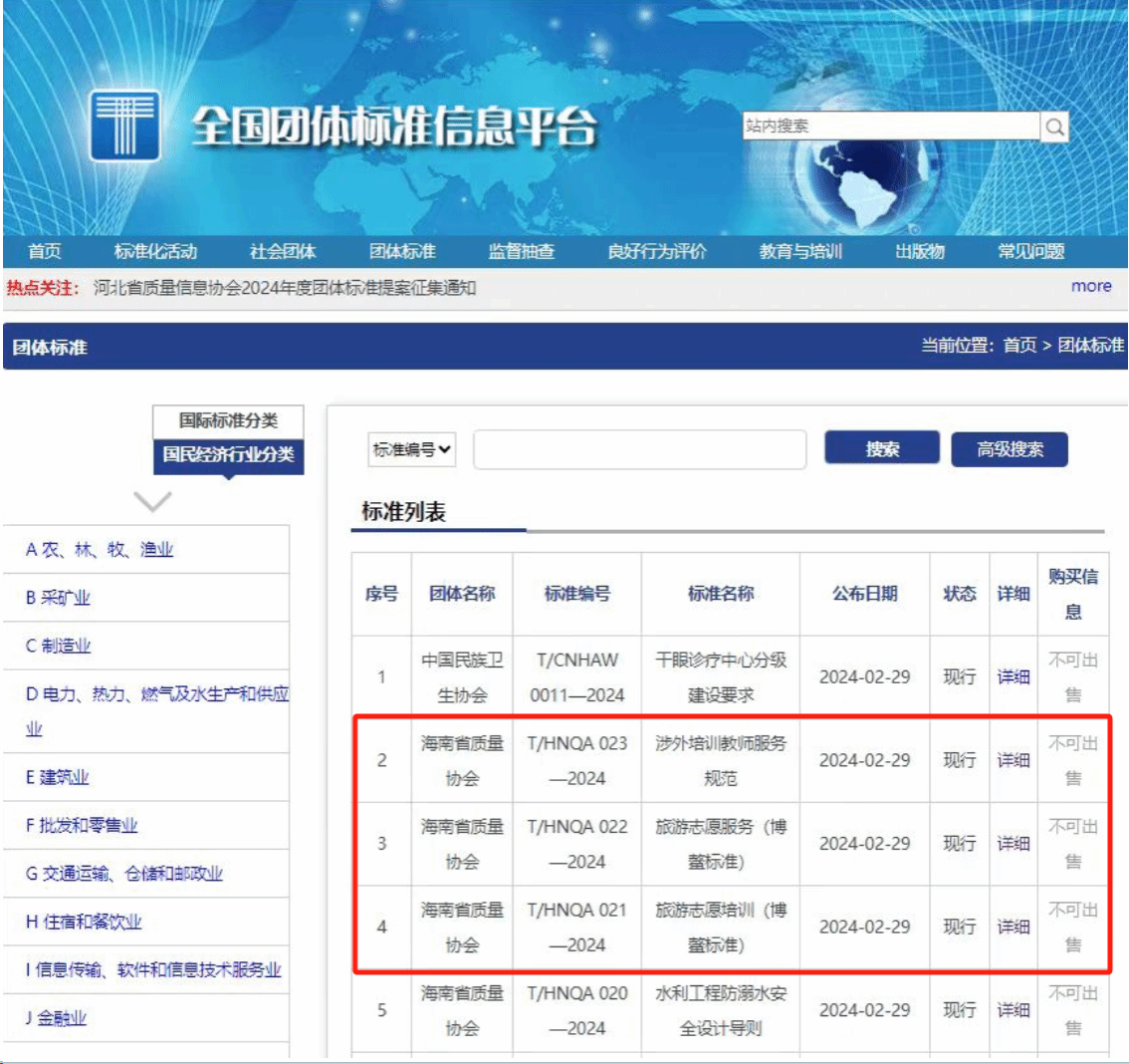 2月29日,由米兰milan官方网站制定的三项团体标准T/HNQA 021-2024《旅游志愿培训(博鳌标准)》、T/HNQA 022-2024《旅游志愿服务(博鳌标准)》、T/HNQA 023-2024《涉外培训教师服务规范》顺利通过专家评审,在全国团体标准信息平台上正式发布。标准由米兰milan官方网站提出,由海南省质量协会立项申报和发布,联合海南省旅游酒店业协会等单位共同起草完成。▼