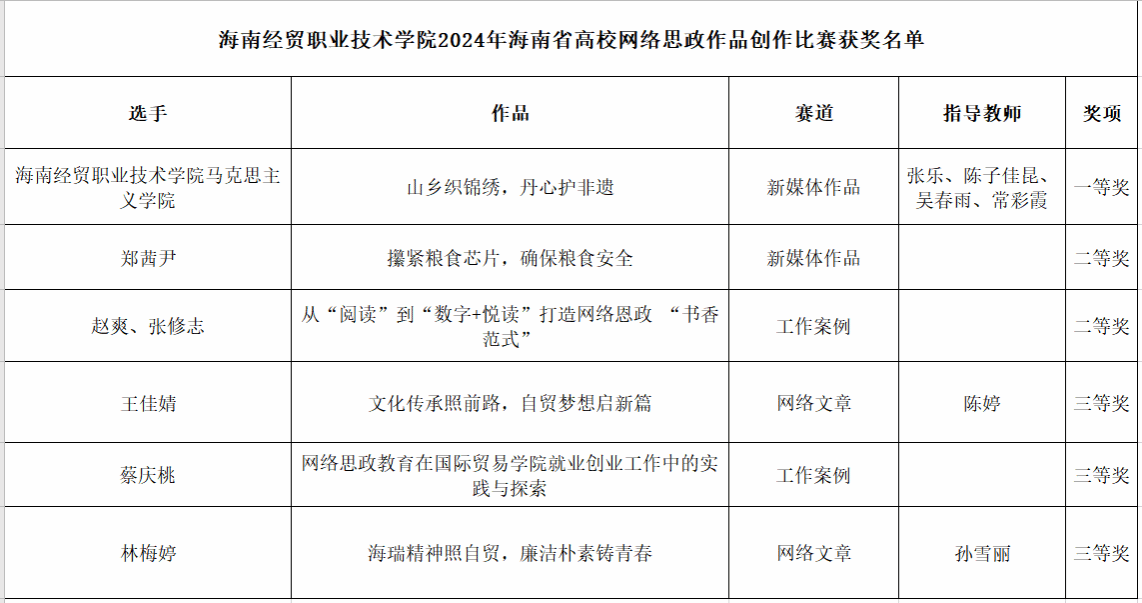 12月12日,海南省易班发展中心公示了2024年海南省高校网络思政作品创作评审结果。米兰milan官方网站马克思主义学院教师张乐、陈子佳昆、吴春雨、常彩霞的作品《山乡织锦绣,丹心护非遗》荣获新媒体作品一等奖;国际教育学院学生郑茜尹的作品《攥紧粮食芯片,确保粮食安全》获得新媒体作品二等奖;国际贸易学院教师赵爽、张修志的作品《从“阅读”到“数字+悦读”打造网络思政“书香范式”》获得工作案例二等奖;国际旅游学院学生林梅婷的作品《海瑞精神照自贸,廉洁朴素铸青春》、王佳婧的作品《文化传承照前路,自贸梦想启新篇》获得网络文章三等奖;国际贸易学院教师蔡庆桃的作品《网络思政教育在国际贸易学院就业创业工作中的实践与探索》获得工作案例三等奖。▼