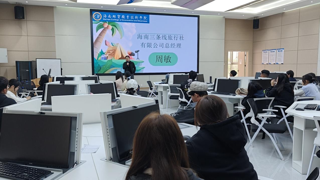 海南三条线旅行社总经理、外聘教师周敏,资深领队、校园导游大赛评委张威,国家特级导游、技能大师工作室负责人敖燕军分别围绕“企业需要什么样的导游人才”“从考证到领队的职业进阶”“‘跟团观摩’到‘独立带团’逐项拆解实操要点”等方面,立足自身经验,为学子带来多维度的职业发展指导。嘉宾们鼓励同学们锚定目标,积极备考专业技能证书,并为已持证学生对接工作室资源,提供实践指导。活动现场互动踊跃,参会学生对职业规划有了更清晰的认知。