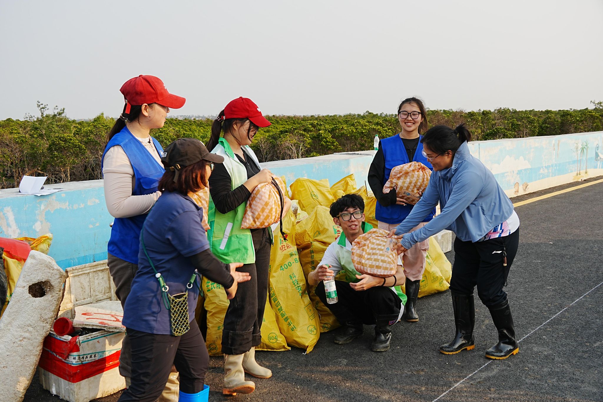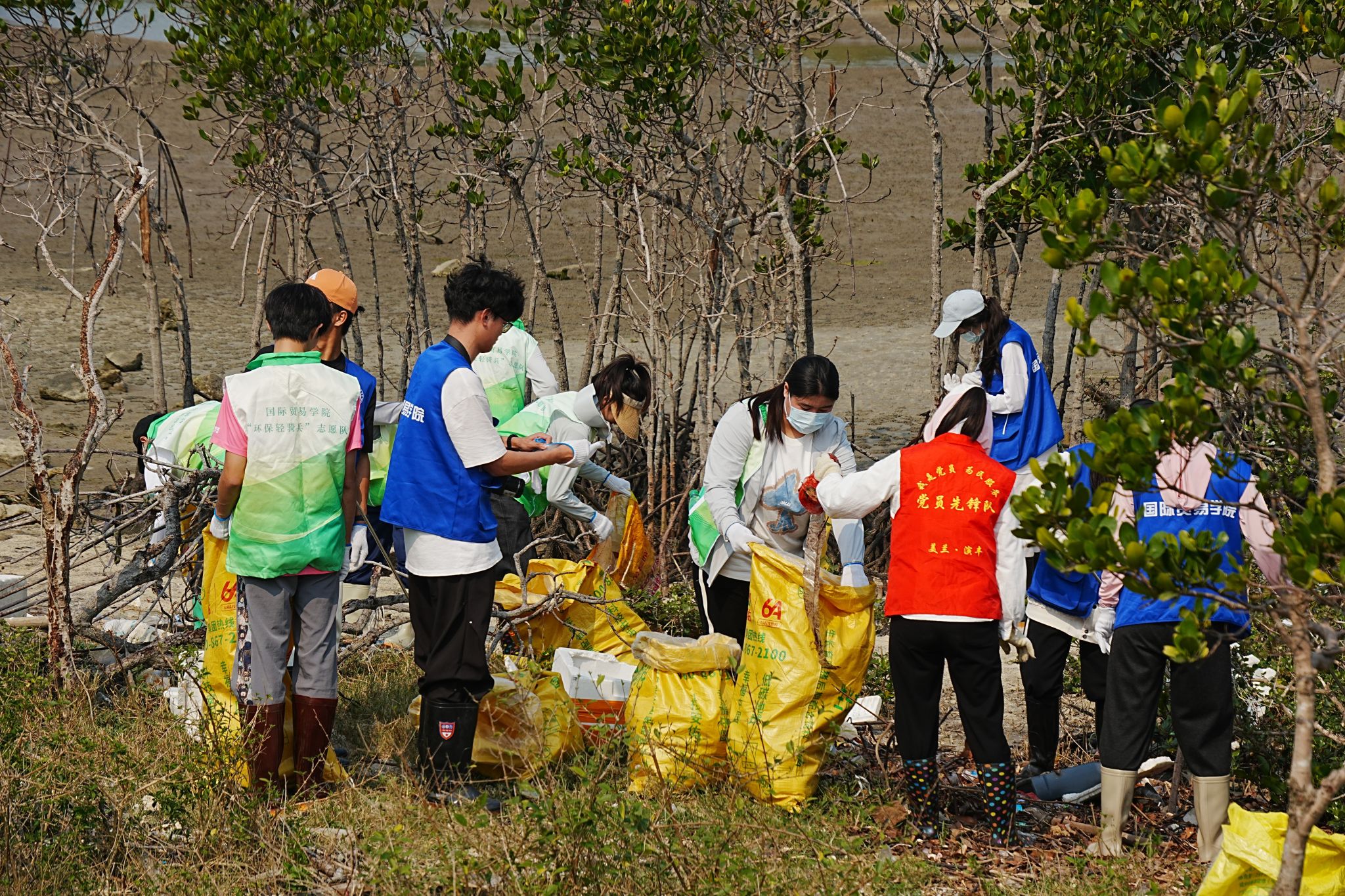 志愿者们以小组对抗比赛的形式进行净滩活动。他们不畏烈日,携带垃圾袋、钳子等工具,沿着退潮后的红树林滩涂,细致搜寻并清理各类垃圾,将塑料瓶、包装袋、泡沫箱、废弃渔网等垃圾一一拾起,以实际行动为滨海渔村增添生态魅力。