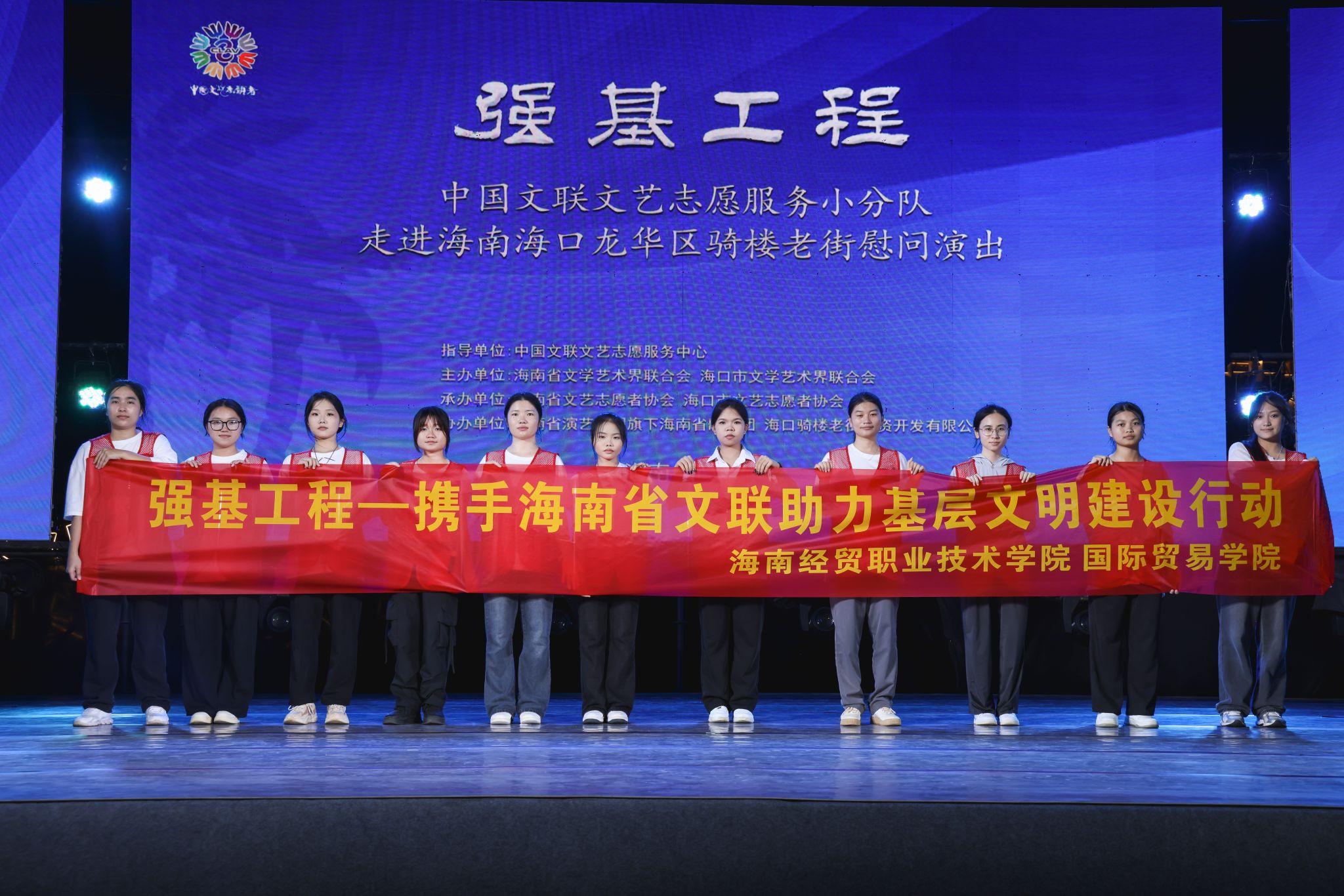 2025 年 6 月 11 日,应海南省文艺志愿者协会邀请,国际贸易学院选派 10 名优秀志愿者代表,参与由中国文联主办的 “强基工程・文艺志愿服务小分队走进海南海口龙华区骑楼老街”慰问演出活动。本次活动在海口骑楼历史文化街区举行,以文艺展演形式助力基层文化建设,吸引了数百名市民游客驻足参与。