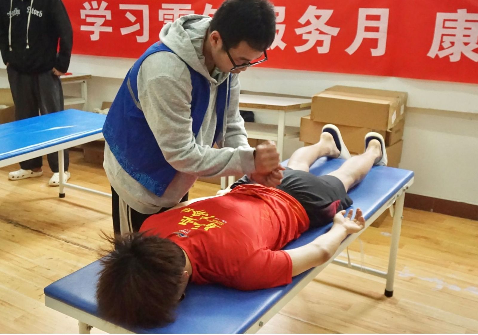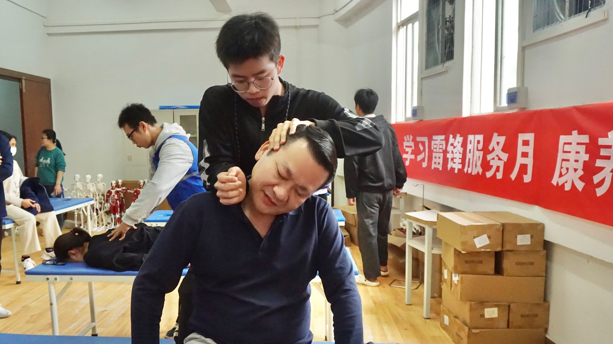 2024年3月12日,体育与健康学院青年志愿者协会在学校体育馆开展“学习雷锋服务月 康养理疗校园行”主题活动,免费为师生提供推拿按摩、疏通经络等理疗服务,深入开展健康知识宣传,提升师生身体健康水平。