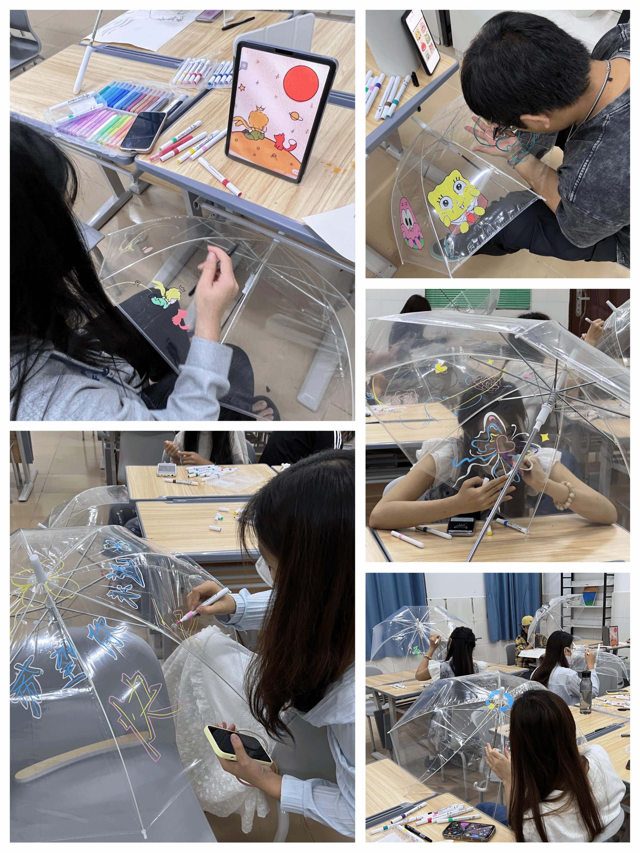 辅导员黄惠向同学们科普了情绪疗愈在心理方面的积极作用及意义,鼓励同学们借助绘画,把焦虑、喜悦、愤怒、期盼等情绪通过绘画投射出来,释放心中情绪。同学们用生动的笔触,在雨伞上描绘爱情、生活、向往、愿望、自我成长等主题图案,展示出自我的独特风格。在这个过程中,大家将注意力转移到创作上,积极交流,互相探讨,分享作品,互相倾诉,写下自己的心愿。