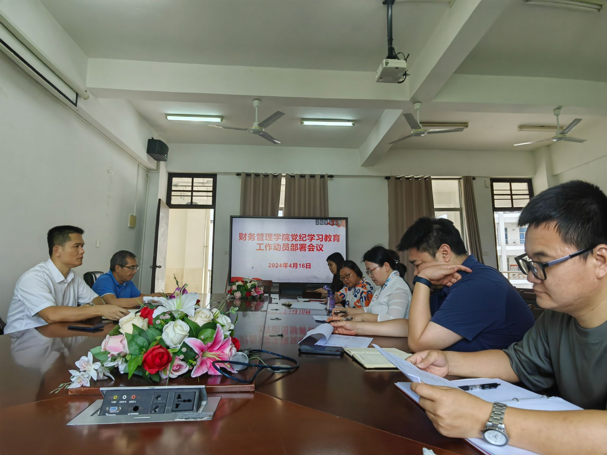 2024年4月16日,财务管理学院党总支召开会议,传达学习学校党纪学习教育部署会议精神,并就学院开展党纪学习教育进行部署。