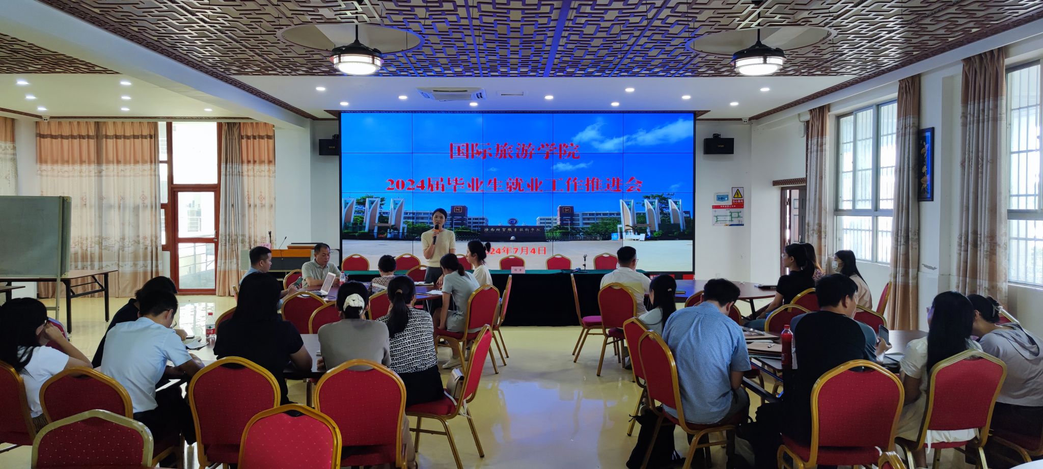 2024年7月4日,国际旅游学院召开2024届毕业生就业工作推进会。党总支书记孙金、党总支副书记刘萍男、全体就业指导老师和辅导员出席会议。
