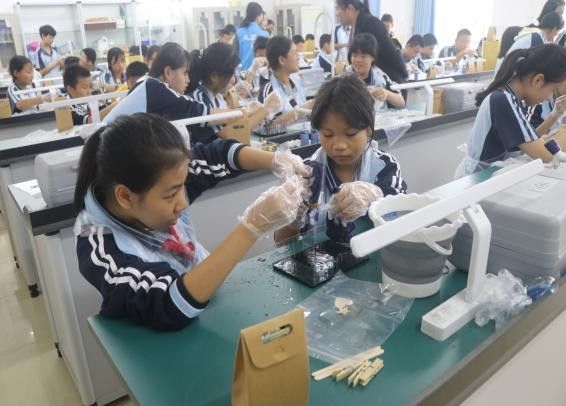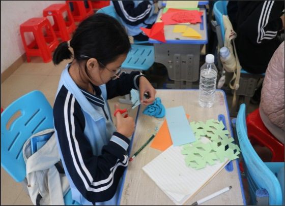 志愿者们通过生动的讲解、精彩的演示和互动体验环节,向中学生们介绍了剪纸、花灯和扎染三项国家级非物质文化遗产的历史渊源、艺术特色与制作技巧。在剪纸展示教室里,同学们被精美的剪纸作品深深吸引,在志愿者的耐心指导下,纷纷拿起剪刀和彩纸,亲手尝试剪出自己喜爱的图案。另一间花灯描绘教室中,同学们接过形状不同的纸糊花灯,在志愿者的传授下巧妙地绘制出龙凤、花鸟等各种图案。灯一亮,惊艳了四座。扎染体验室内则充满了创意与惊喜。同学们发挥想象力,将白色的布料染成了色彩斑斓、独一无二的艺术品。