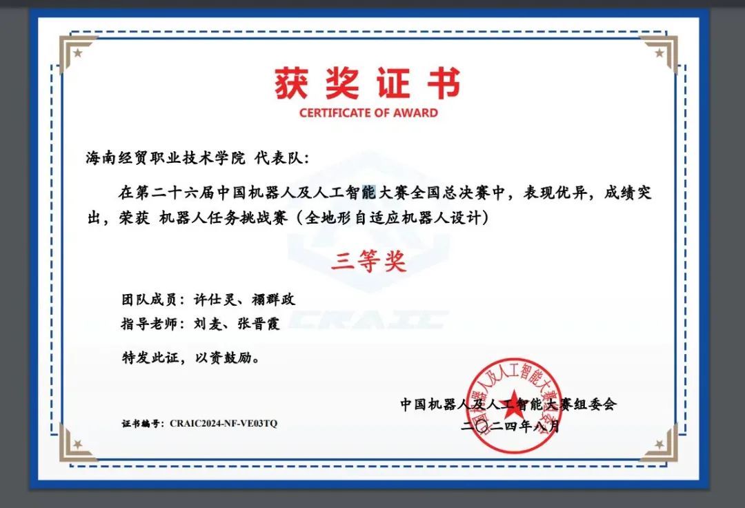 在第六届国际青年人工智能大赛探索者全地形运载机器人任务挑战赛(东部赛区)和第十八届 ICNA 大学生创新创业大赛(华南赛区)中,许仕灵与小伙伴们并肩作战,默契配合,同样收获了三等奖的优异成绩。两年间,他累计获国家级荣誉2项、省级荣誉7项、校级荣誉12项。抽屉里那一张张涂满修改痕迹的设计图,电脑里那一组组存储的实验数据,见证着他对专业的赤诚热爱,也彰显着他用专业技能为国家科技发展添砖加瓦的决心。“毕业后我想从事智能控制方面的工作,这些竞赛经历为我打下坚实的基础,也让我更有信心面对未来的挑战”,许仕灵说。