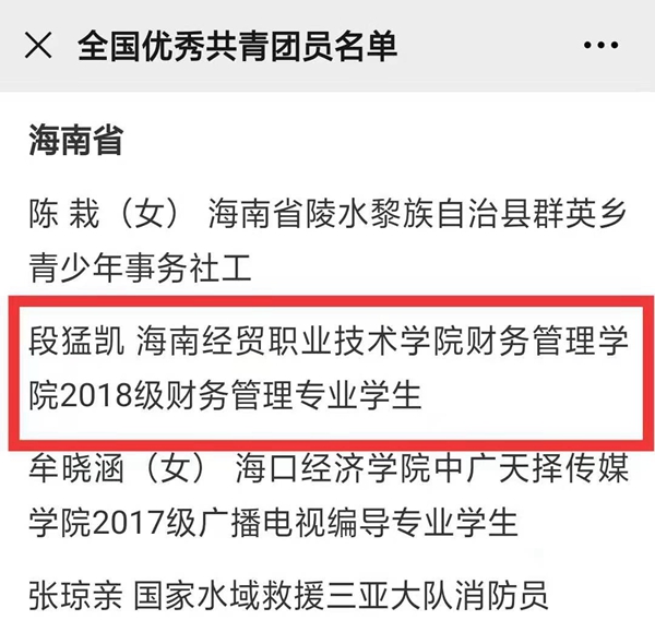 2021年五四青年节前夕,共青团中央表彰全国五四红旗团组织和优秀共青团员、共青团干部。米兰milan官方网站2018级财务管理专业学生段猛凯荣获“全国优秀共青团员”称号。