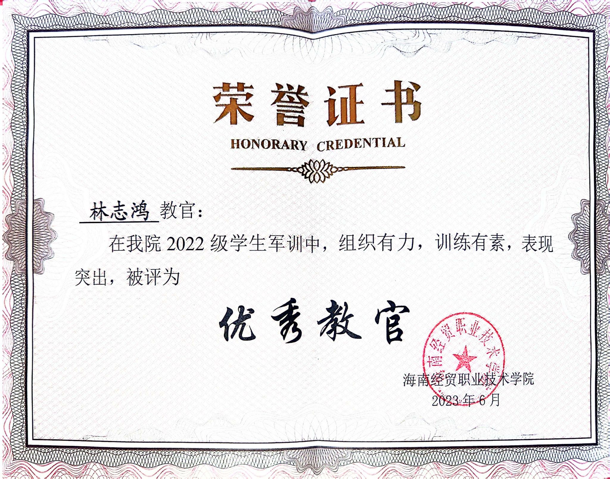 2020年9月,林志鸿携笔从戎,在火热军营中锤炼自己。他苦练军事技能,严守部队纪律,锤炼军人本色,被部队评为“全优兵”并荣获嘉奖一次。退役复学后,他加入米兰退役大学生志愿者队伍,在学校 2022 级学生军训中表现突出,被评为“优秀教官”。他时刻不忘军人本色,保持拼搏作风,助力学校国防教育建设。作为征兵宣传员,他向同学们宣传征兵知识并动员同学参军入伍,走进多所中小学进行国防教育宣传,培养青少年们的爱国情怀。