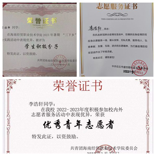 课堂上,他是专注的聆听者;课后,他是知识丛林的探险家。在校期间,李浩轩一直把学习放在首位,积极投入到各门基础课和专业课的学习中,在2022-2023学年专业成绩和学生综合素质测评中均排名第一。他积极参加芬兰线上国际交流合作培训班、Shopee跨境电商基础运营技能等专业相关培训,不断拓展知识。在做好专业学习的同时,他积极参加各类竞赛,获得国家级OCALE跨境电商创新创业大赛三等奖、全国首届大学生职业规划大赛省赛三等奖、“中国教育电视台•外研社杯”职场英语挑战赛(写作赛项)海南赛区一等奖、校级电子商务“三创赛”两项二等奖。“通过参加竞赛,我学习了理论知识,增强了专业技能,也为我的职业发展奠定了良好的基础。”李浩轩说。